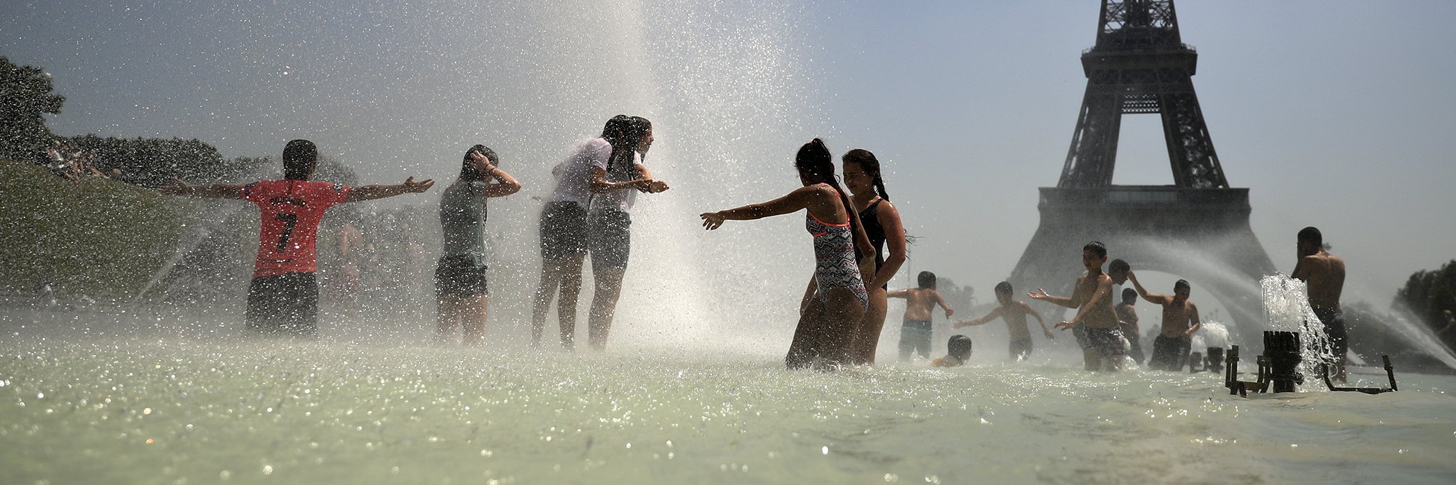 Youngsters cool off at the Trocadero public fountain in Paris on June 26, 2019. High temperatures are expected to go up to 39 degrees Celsius (102 Fahrenheit) in the Paris area later this week and bake much of the country.