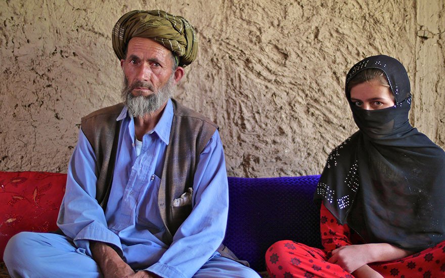 Fifteen-year-old Zainab (not her real name) sits beside her father, Mohmod. Culturally, at this age she must cover her face and should not typically be in the company of a man outside of her family. But because I am with two female colleagues, Mohmod has made an exception and Zainab has permission to speak with me.