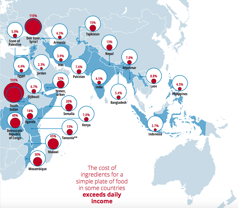 In the poorest country in the survey, South Sudan, this same simple plate of food would cost USD $321.70, or 155% of a person’s daily income.
