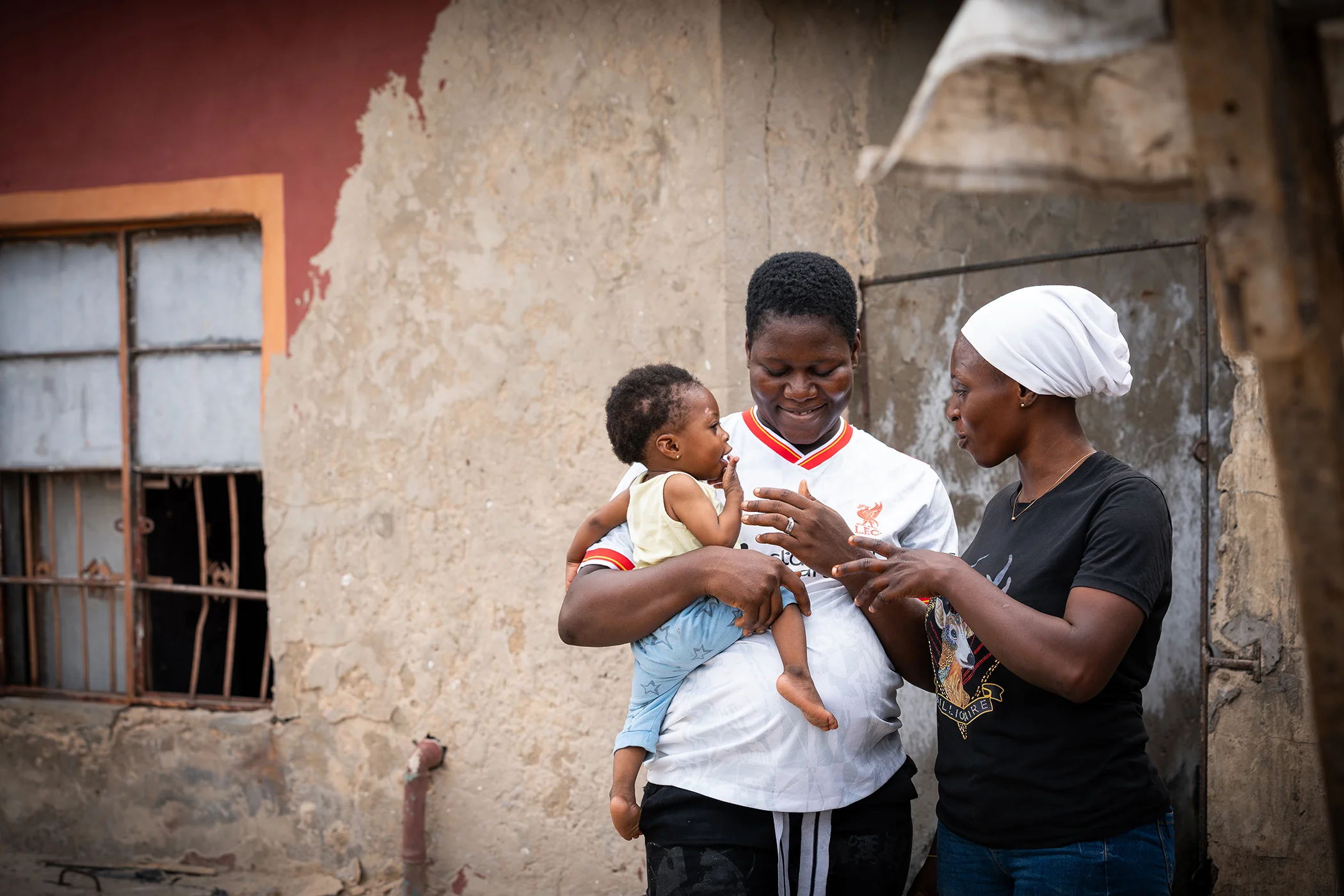 Ashiata Maku stands next to her sister in law, Adegbesan Fathia, as she holds her 10-month-old baby outside their home in Lagos, Nigeria. Ashiata is a beneficiary of the Wellbeing Foundation’s Mamacare 360 program. Image: Grace Ekpu for Global Citizen