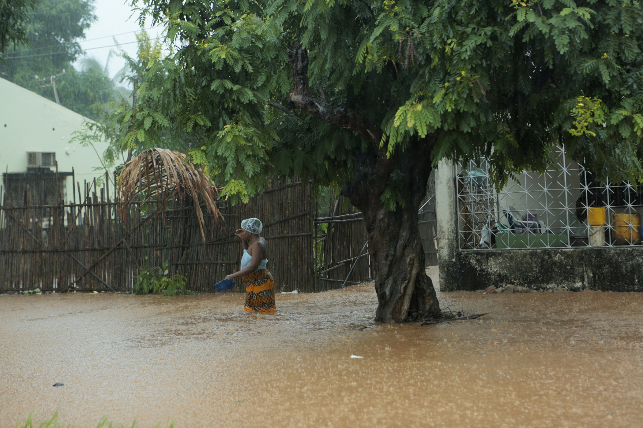 A woman walks through rising waters in Natite neighbourhood, in Pemba city on the northeastern coast of Mozambique, Sunday, April, 28, 2019. Serious flooding began on Sunday in parts of northern Mozambique that were hit by Cyclone Kenneth three days ago, with waters waist-high in areas, after the government urged many people to immediately seek higher ground.