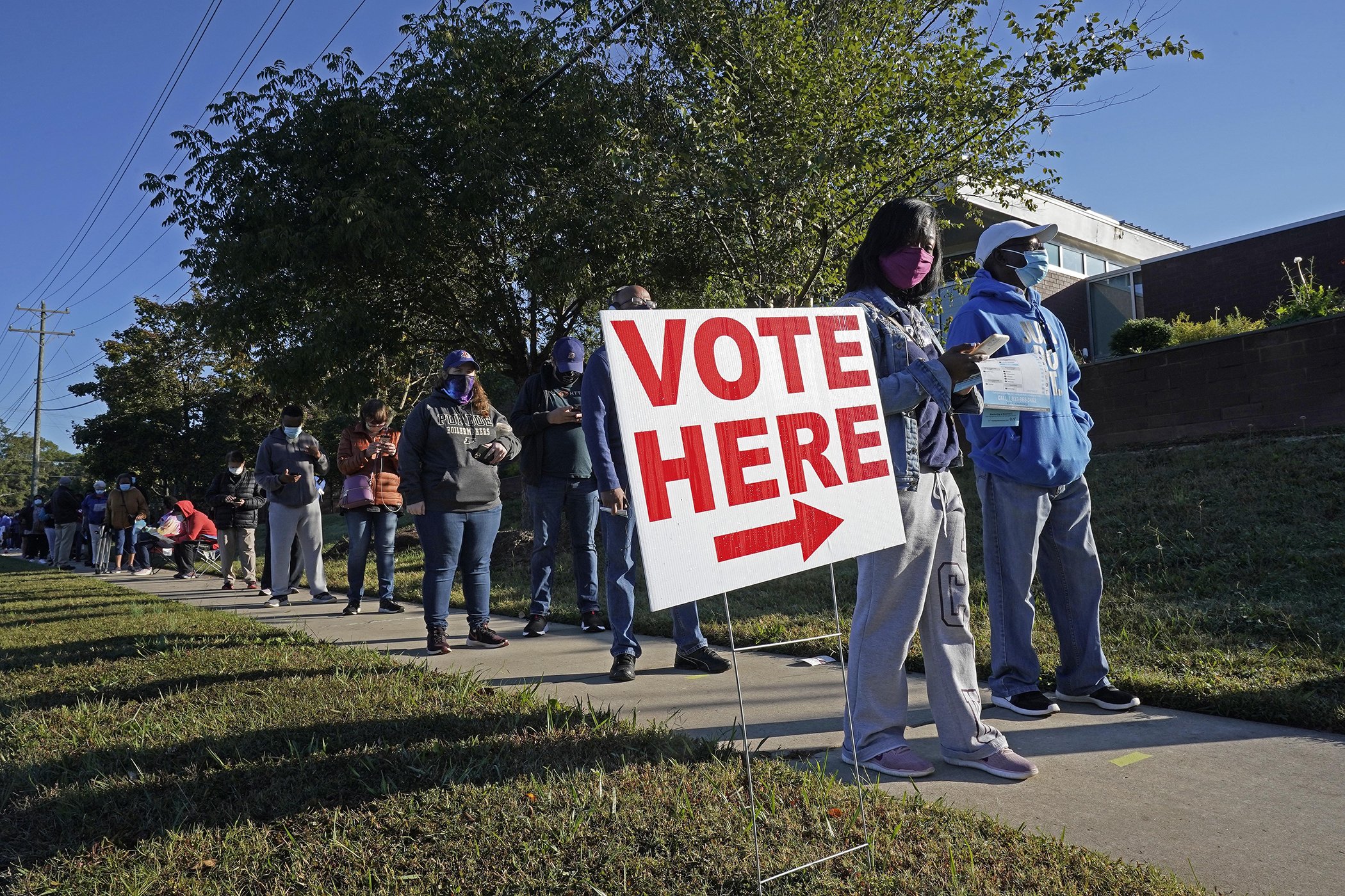 Early voters line up to cast their ballots at the South Regional Library polling location in Durham, N.C., Oct. 15, 2020.