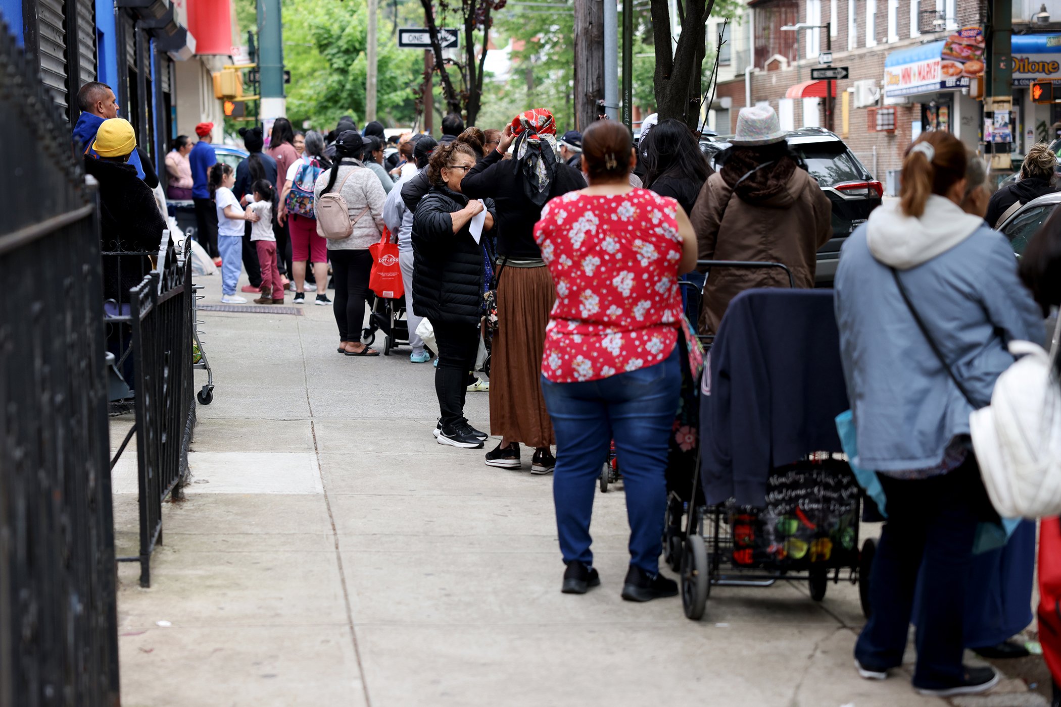Lines form around the block for food distribution at Expecting Relief in Brooklyn, NY on May 17, 2024.