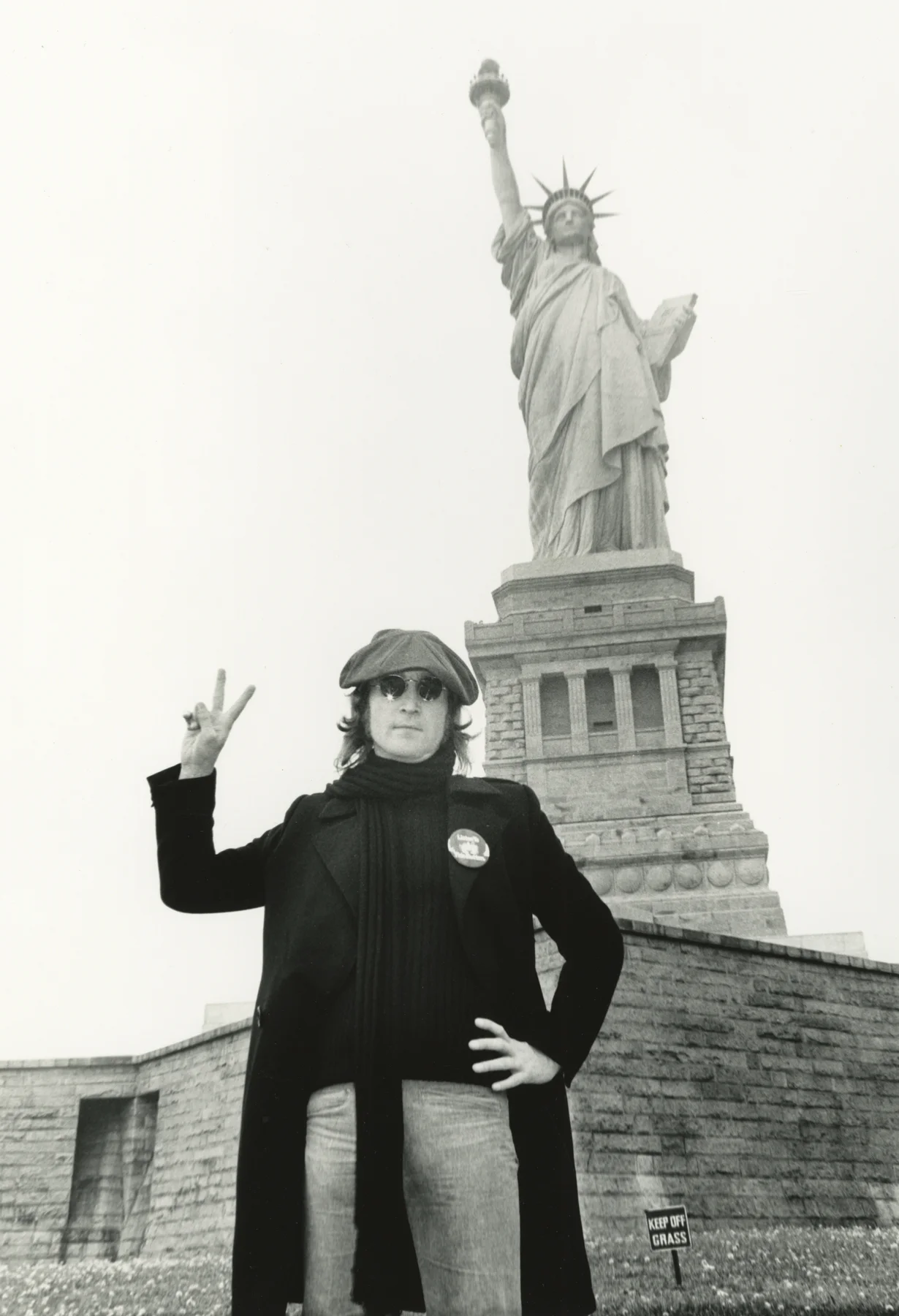 An unlikely image from the past — a photo of musician John Lennon, his hand in a peace sign, in front of the Statue of Liberty — pulls the show’s very current message about the people who made America great sharply into the present.