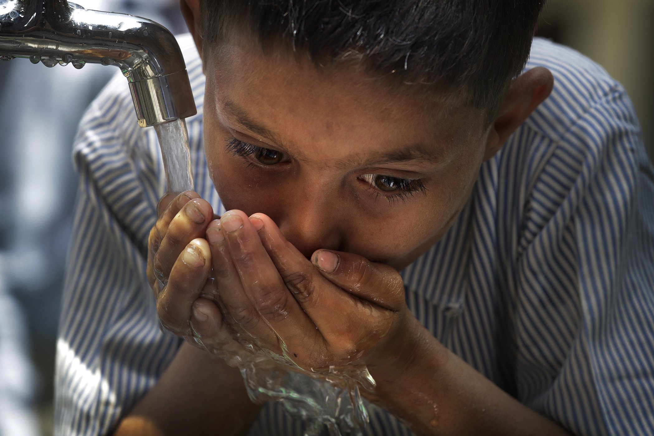 A boy drinks water from a newly set up water filtration tower in his school in Nai Basti Village, some 35 miles from in New Delhi, India, March 22, 2017.