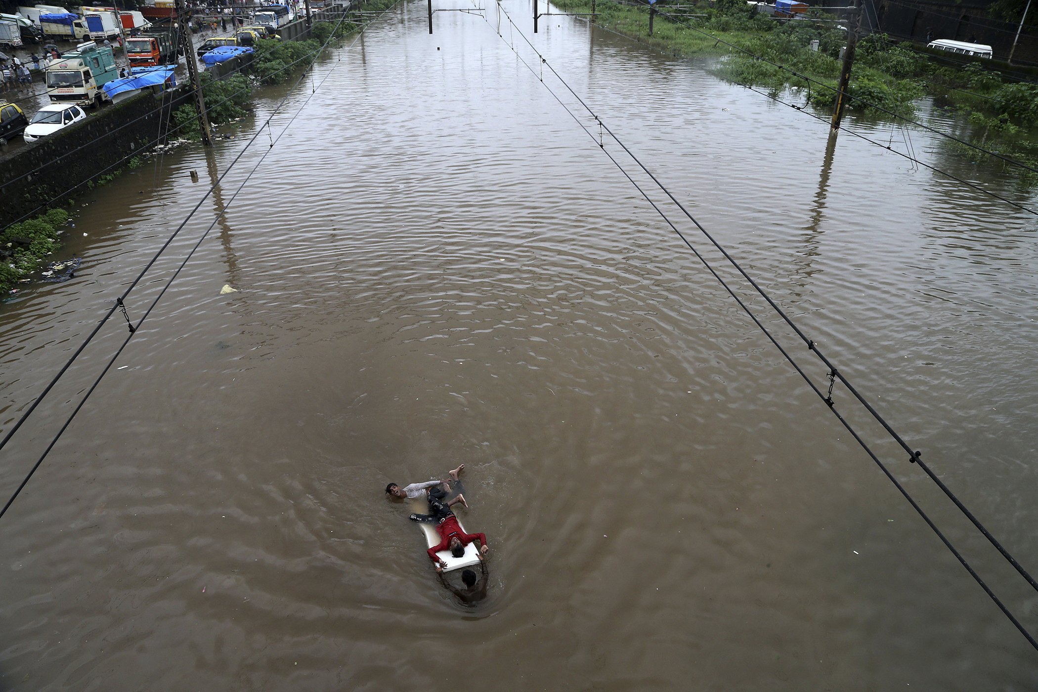 Youth play at a flooded train track following heavy monsoon rains in Mumbai, India on Aug. 4, 2019.