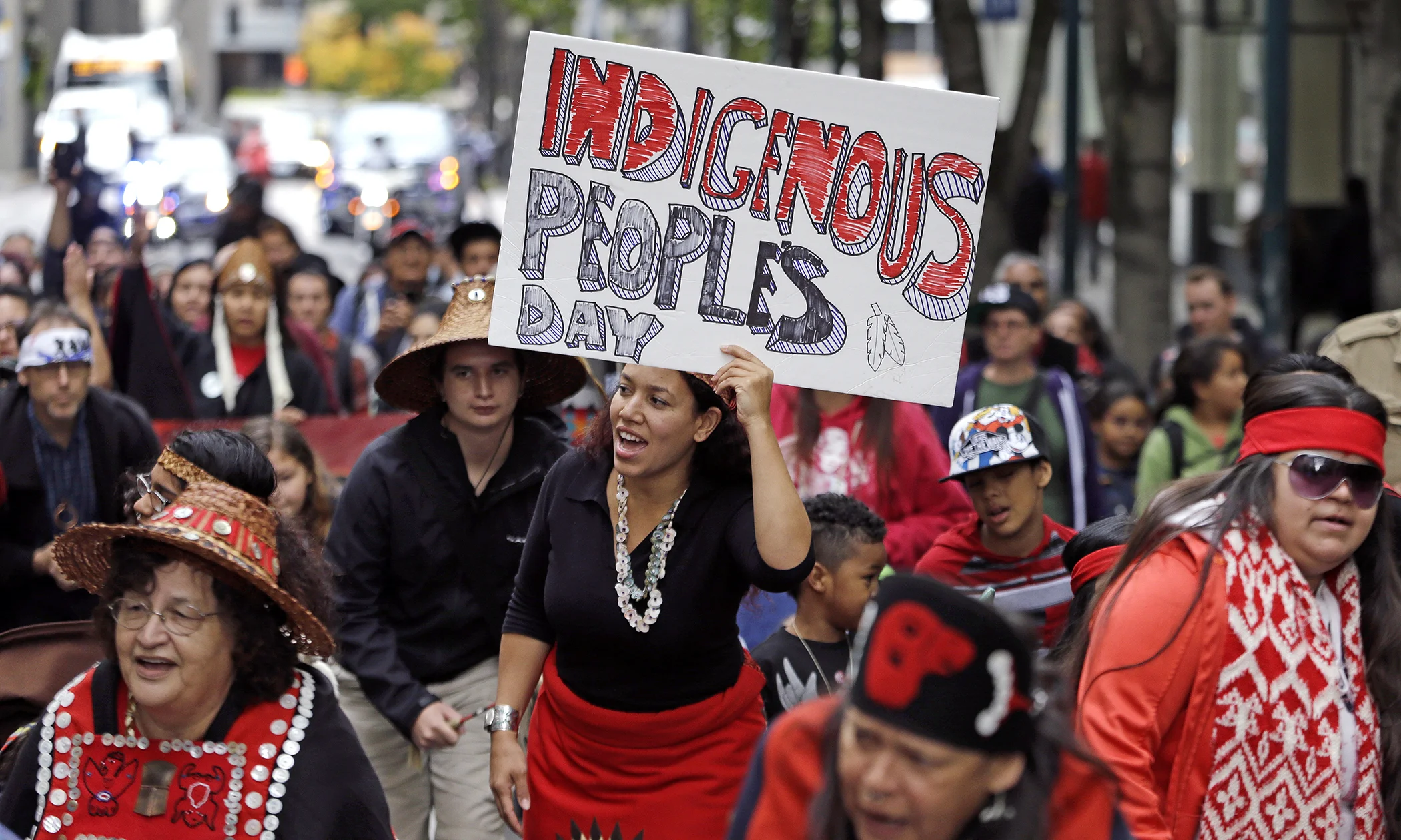Miriam Zmiewski-Angelova, center, holds a sign for Indigenous Peoples Day during a demonstration and march, Oct. 12, 2015, in Seattle.