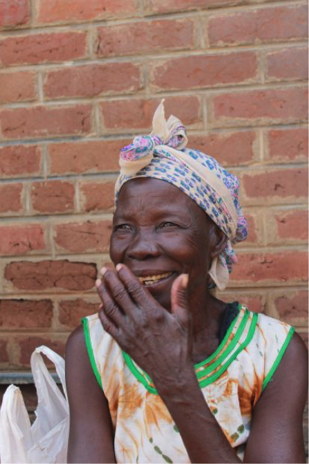 Grateful, this matriarch from your neighbouring village waits in the shade as a younger member of her community helps gather her food basket.