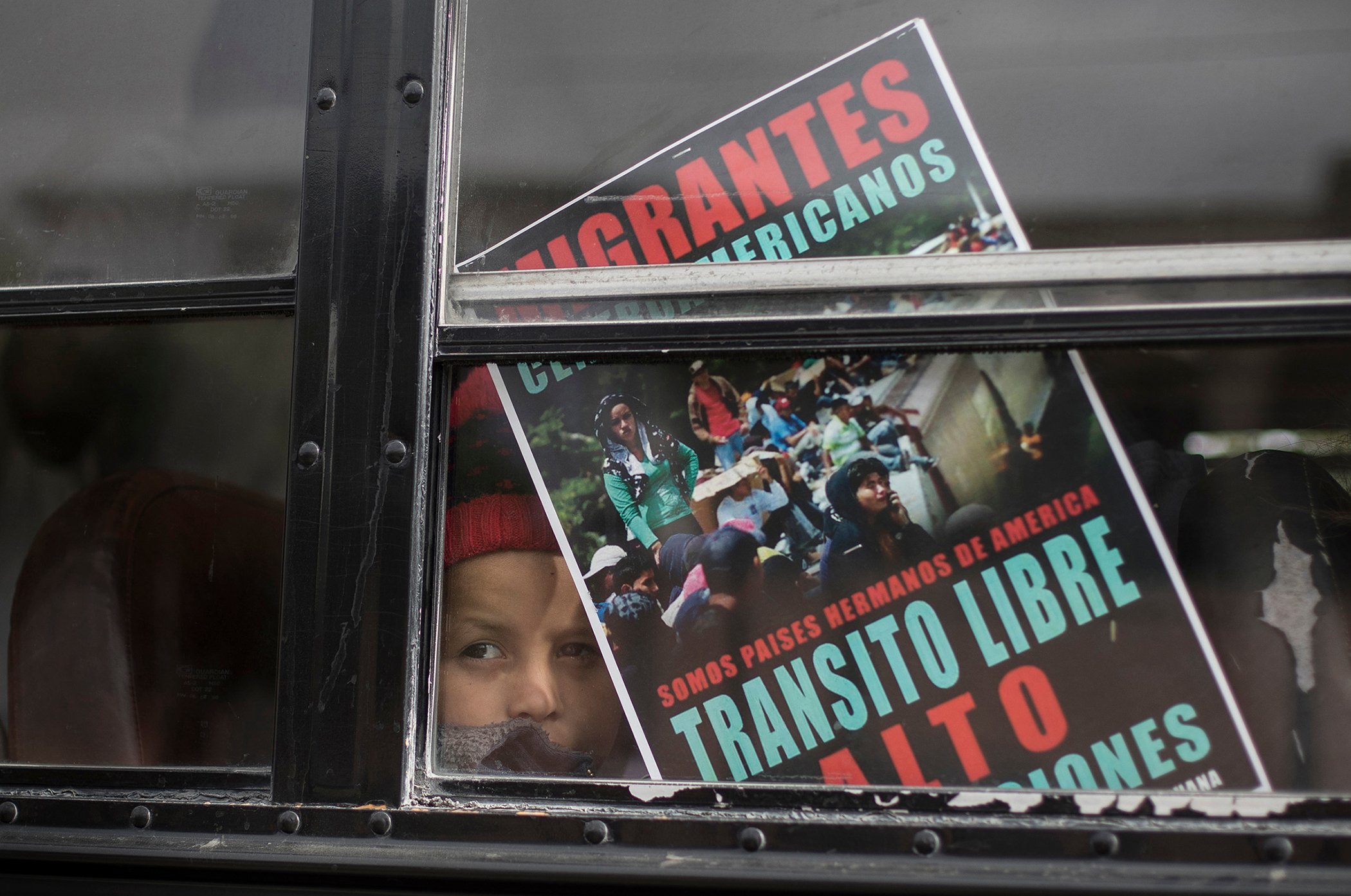 A Central American child who is traveling with a caravan of migrants, peers from a bus carrying the group to the border wall in Tijuana, Mexico, April 29, 2018.
