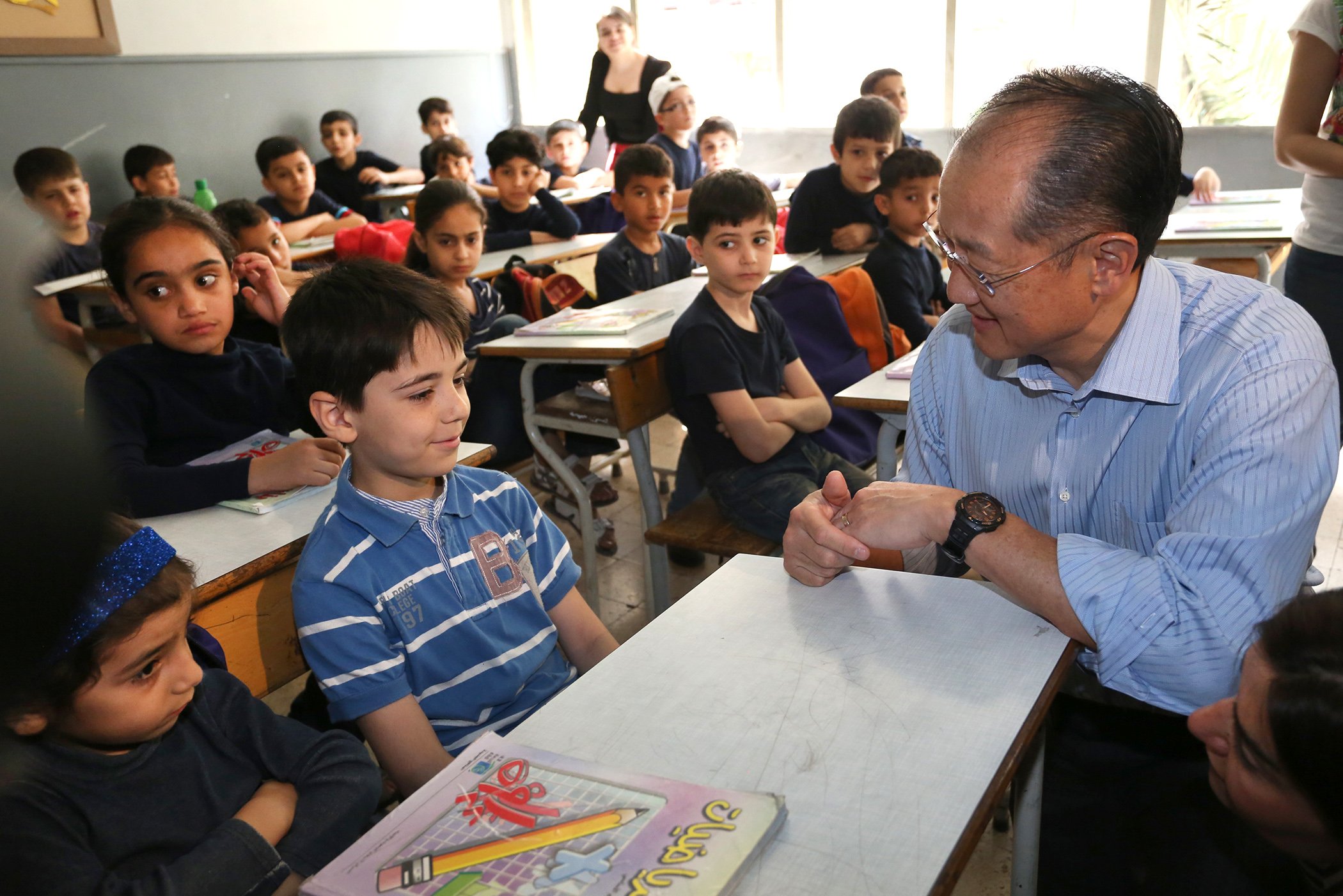 World Bank Group President Jim Yong Kim visits classrooms filled with Syrian refugee students at the Bourjhammoud Public School #2 in Beirut, Lebanon on June 3, 2014.