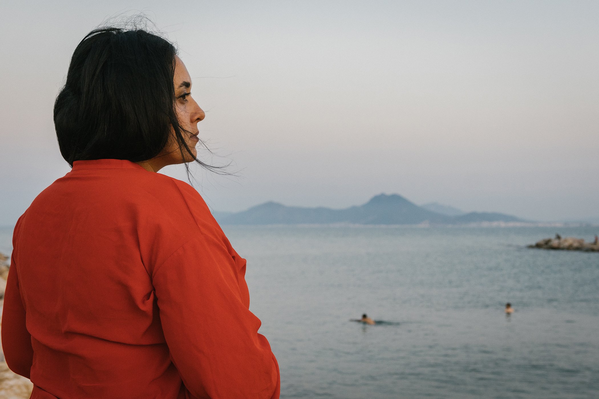 Nada Mansour takes a break from painting on the coast of La Goulette in Tunisia, where the landscape offers both inspiration and a deep emotional connection to her background. Pictured on June 24, 2025.