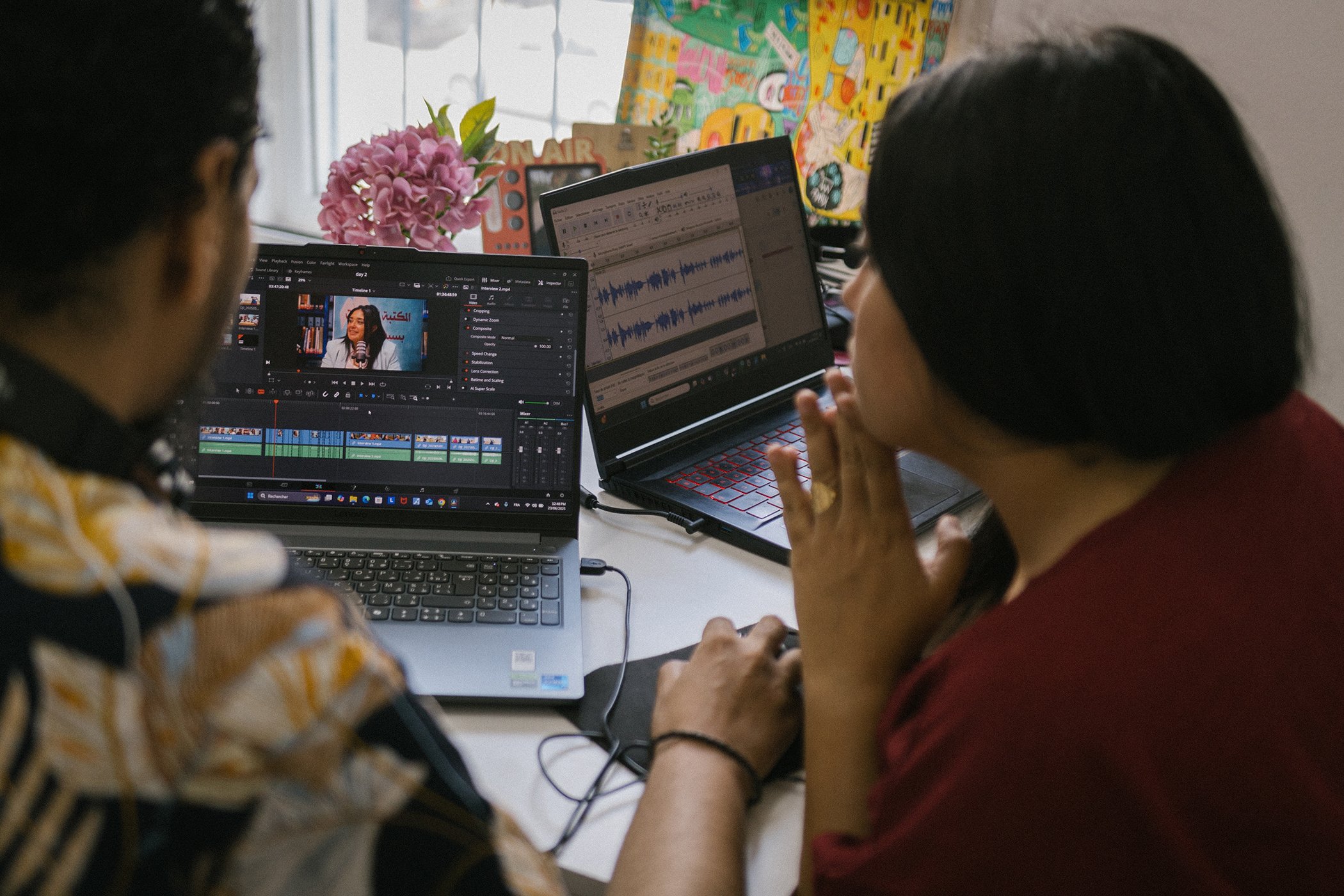 Nada Mansour reviews video and sound levels during a post production session with her colleagues at Express FM in Tunisia on June 24, 2025.