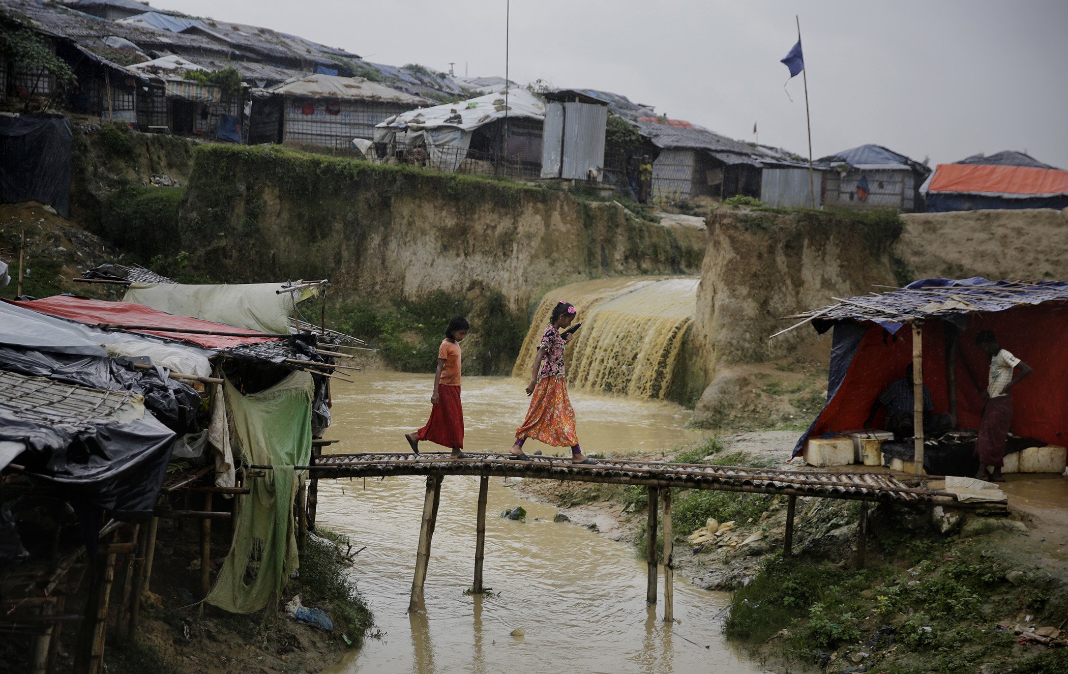 Rohingya refugee girls cross a makeshift bamboo bridge at Kutupalong refugee camp, where they have been living amid uncertainty over their future after they fled Myanmar to escape violence a year ago, in Bangladesh, Aug. 28, 2018.