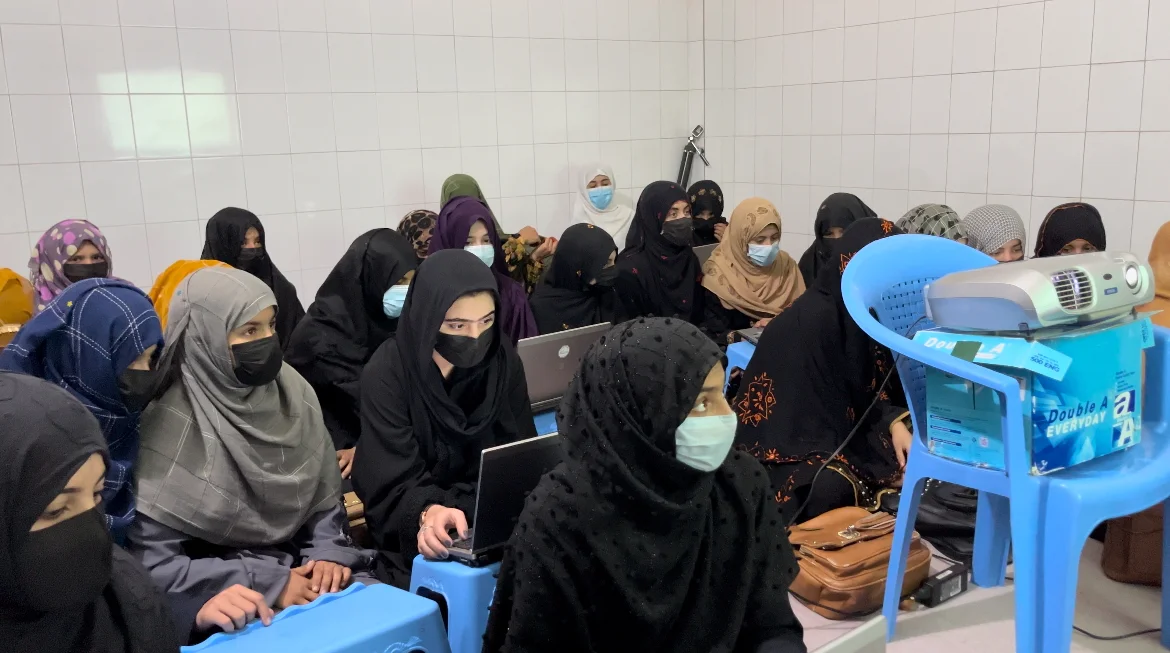 Students look at the lesson on a projector as they work on their laptops during a computer class at Malalai School.