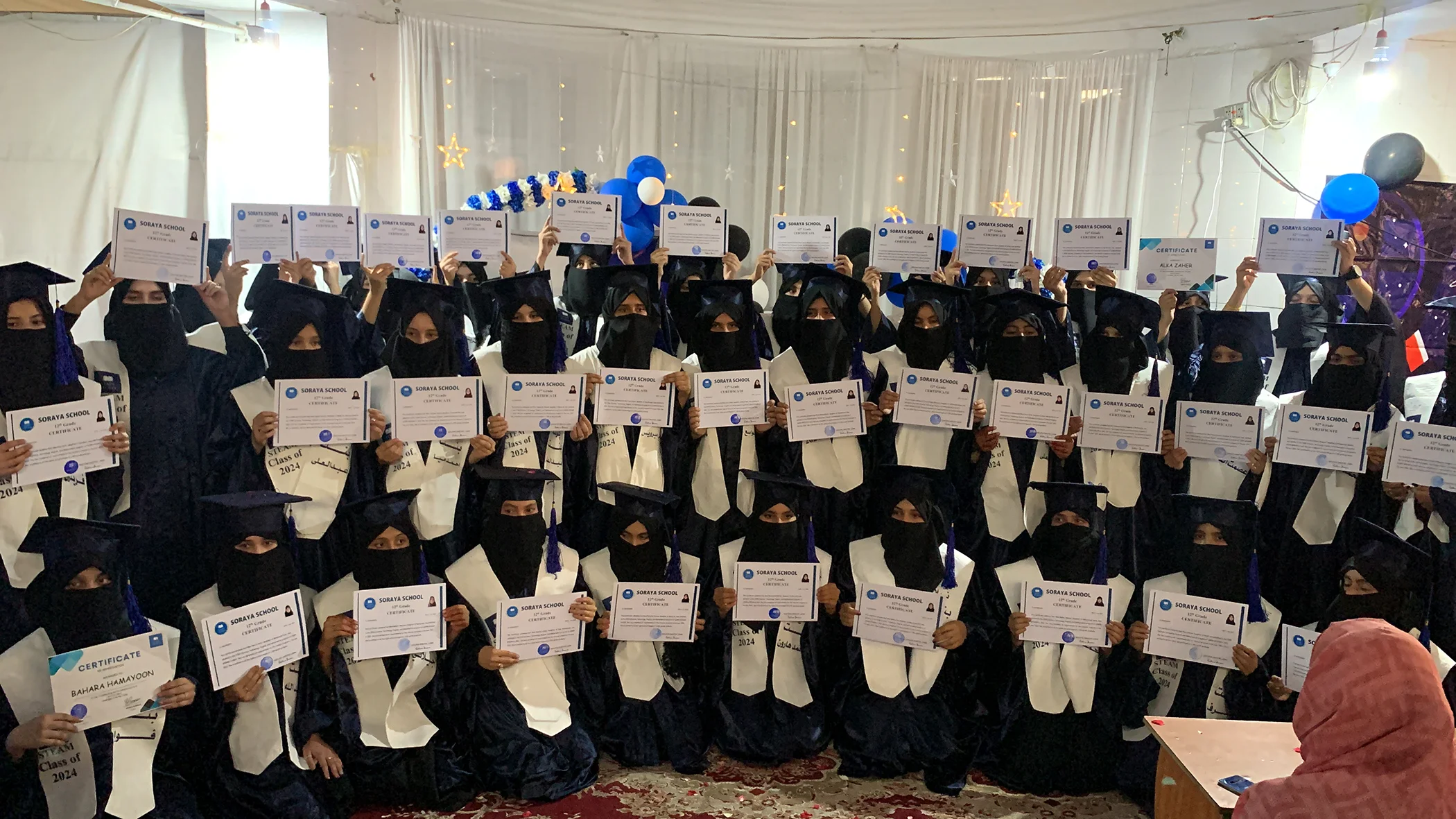 Thirty six students hold their transcripts after graduating from STEM classes and receiving their certificates from Soraya School.