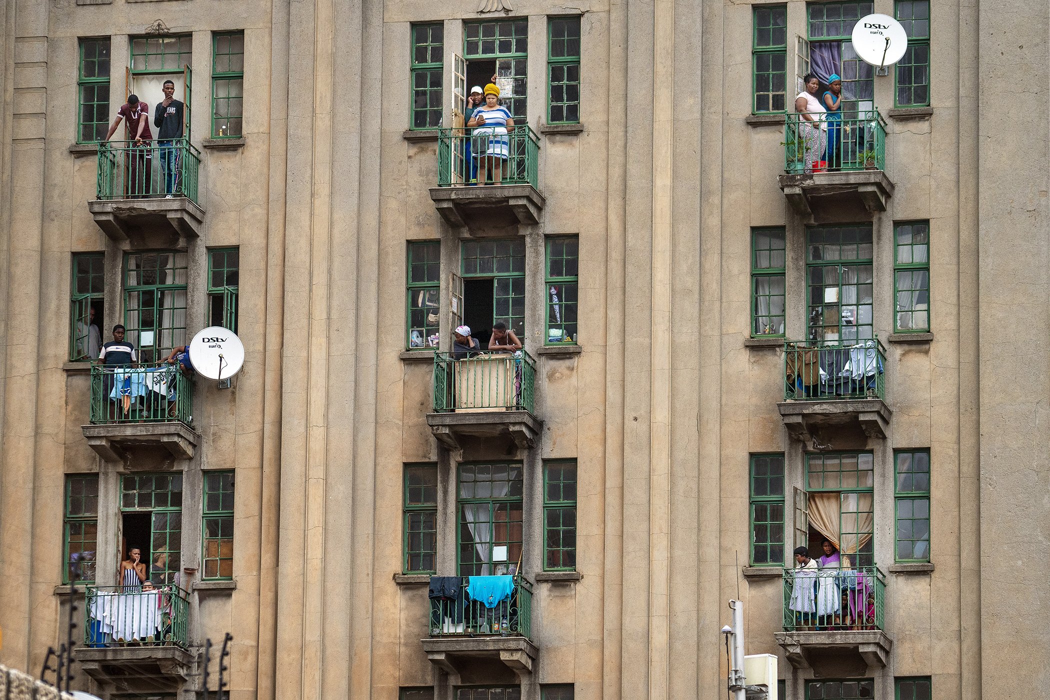 Residents watch as police and National Defense Forces search for a business they thought was illegally open in Johannesburg on March 30, 2020. South Africa went into a nationwide lockdown for 21 days in an effort to control the spread of the coronavirus.