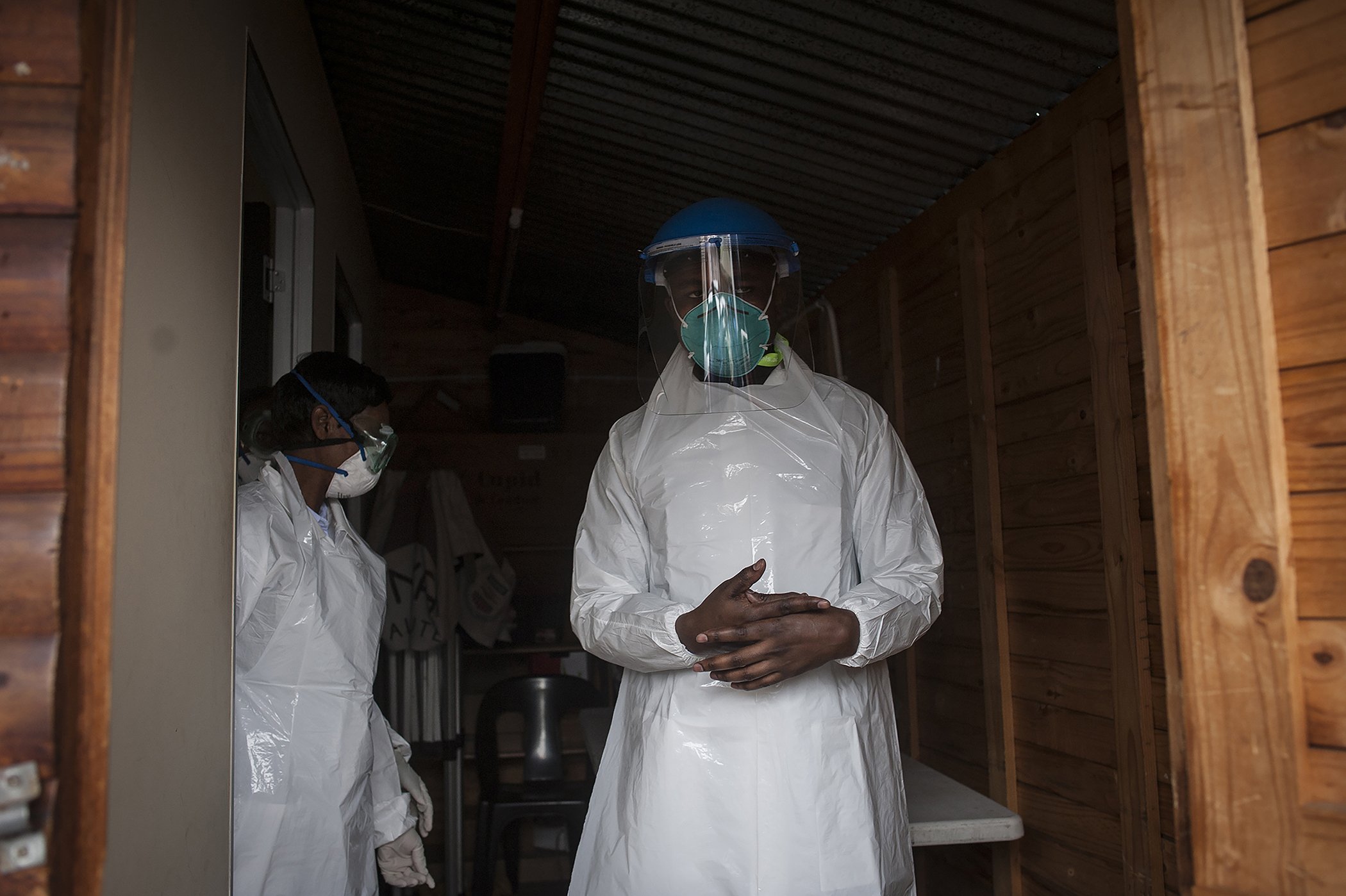 Medical workers prepare to test people for COVID-19 in a mobile testing unit in Yeoville, Johannesburg on April 3, 2020 in South Africa.