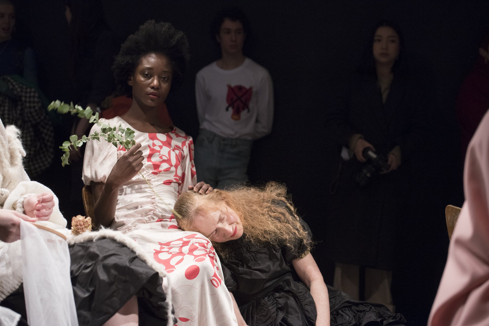 Meanwhile, splashes of red on white dresses symbolise the fight to end female genital mutilation; black early 18th century wedding dresses represent the harmful practice of child marriage; and a repeating shield motif inspired by the basic meaning of the Latin word “vagina” being “sheath.”