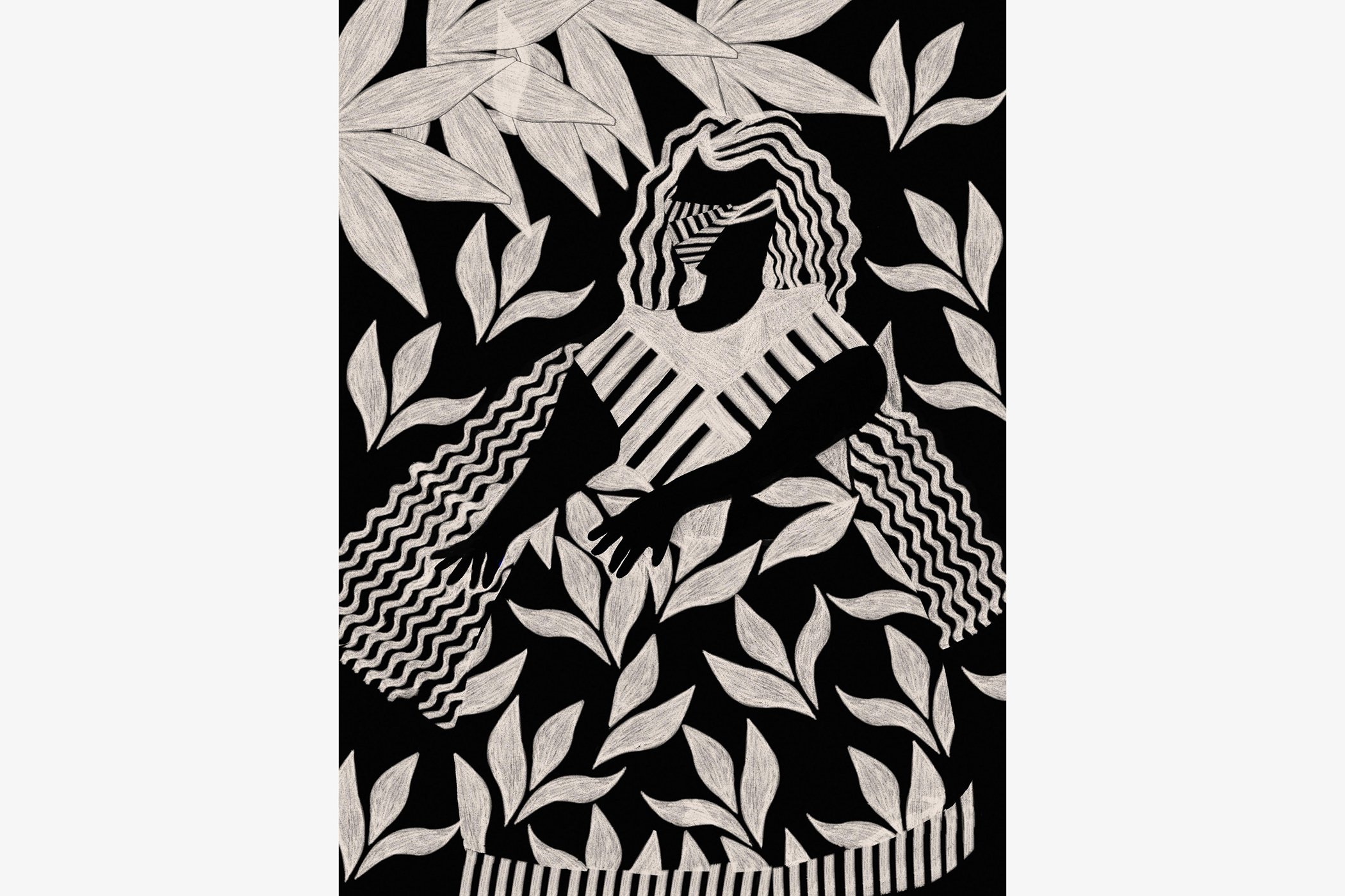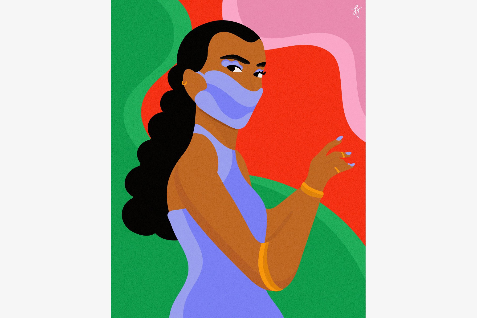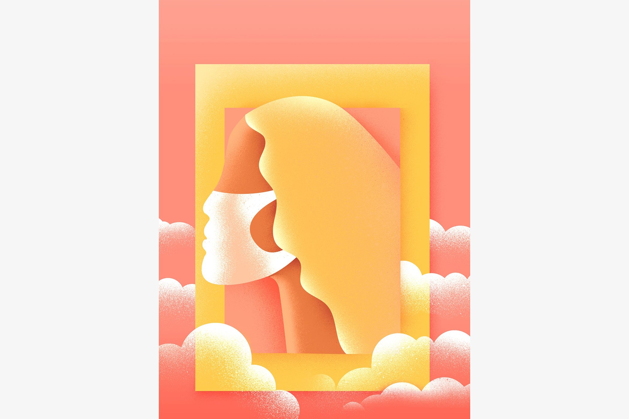 “For this illustration, I wanted to graphically interpret spaces inside and outside from geometric shapes and colors. The representation of clouds as freedom and the use of the mask as the only safe way to be in that space.” —Bárbara Maligoli.