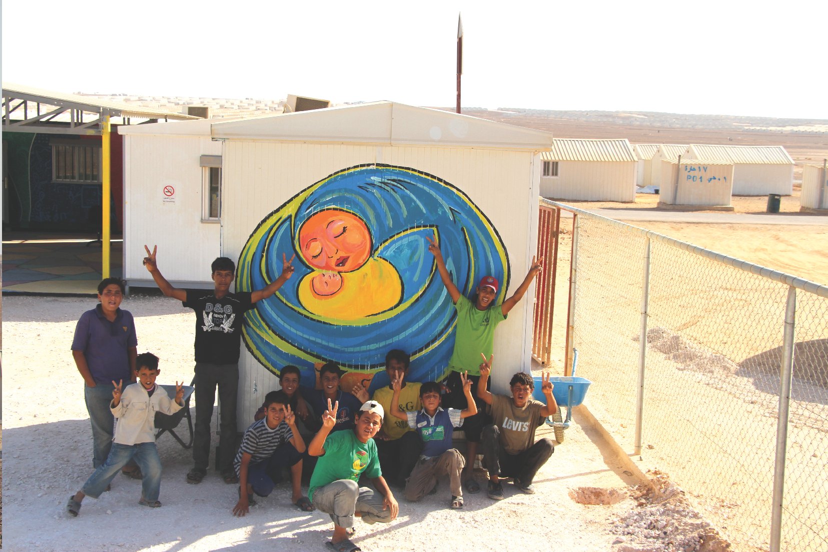Children in front of a mural at the Azraq Syrian Refugee Camp in Jordan.