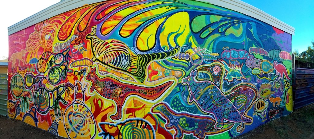 Australian mural with Aboriginal community with Purple House Dialysis Center and Baker Institute, Alice Springs Central Desert.