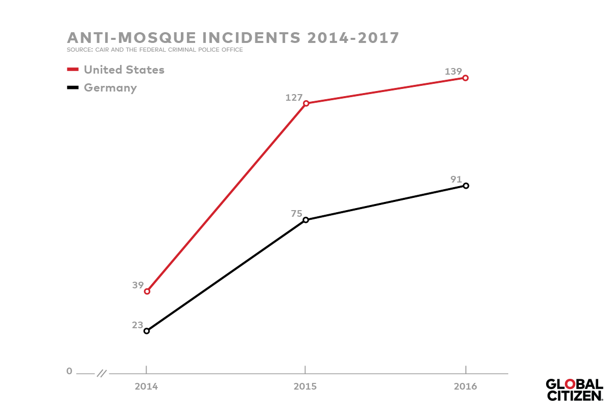 One country that’s seen a significant increase in attacks on mosques is Germany; it’s also host to one of the largest Muslim populations in Europe, with an estimated 4 million Muslims. In 2014, there were 23 violent assaults against Muslim worship facilities; in 2015, there were 75; and in 2016, there were 91 incidents, according to Germany’s Federal Criminal Police Office.
