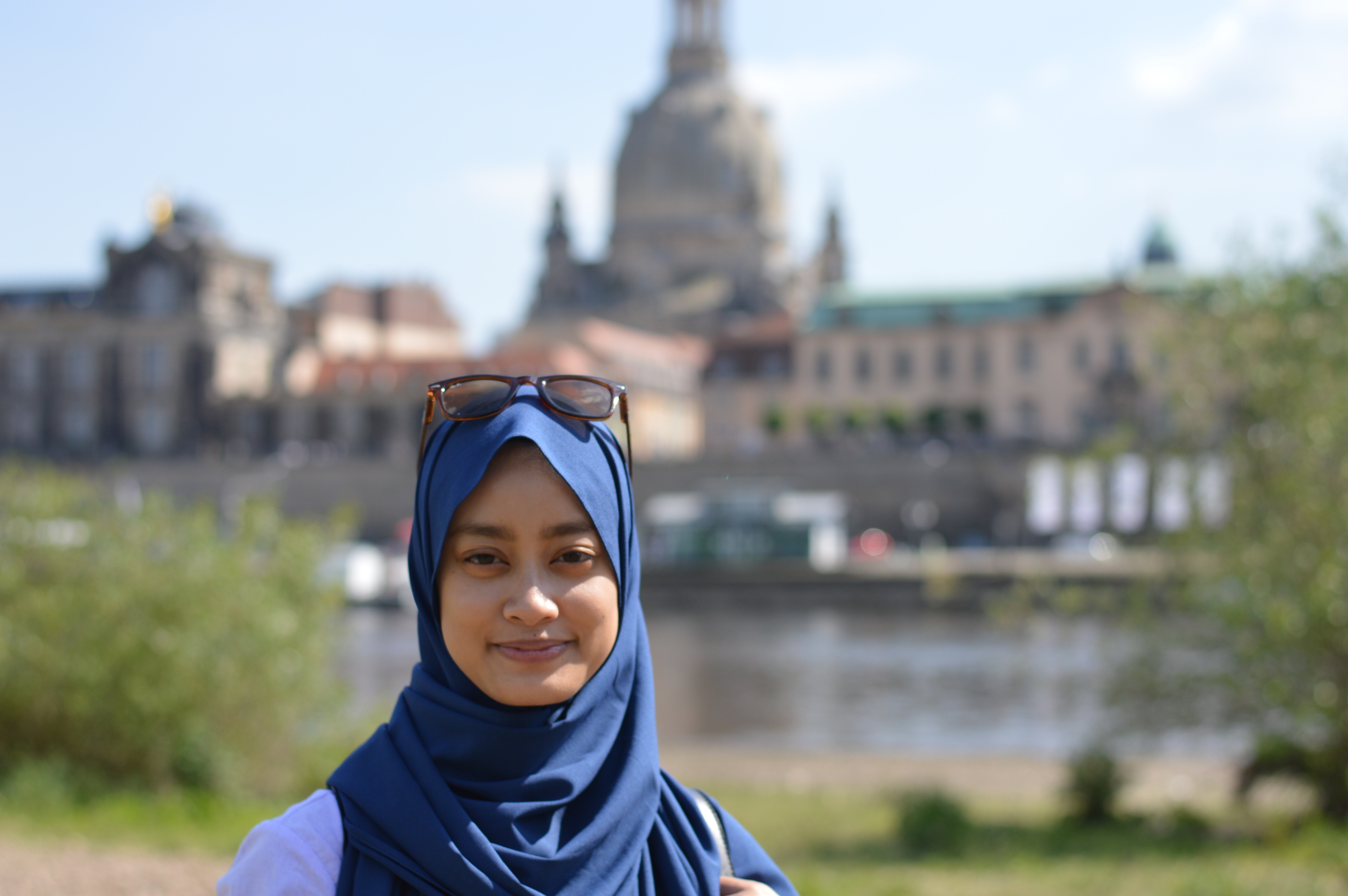 Nurul Fatimah Khasbullah stands alongside the Elbe river, with Dresden's landmark Frauenkirche, "Church of Our Lady," in the background.
