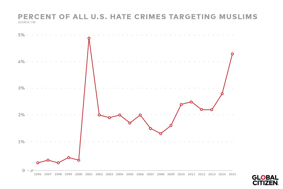 In 2015, 4.3% of all hate crimes were anti-Muslim. That’s nearly the same level as just after the Sept. 11, 2001, terror attacks, when that number hit 4.9%.
