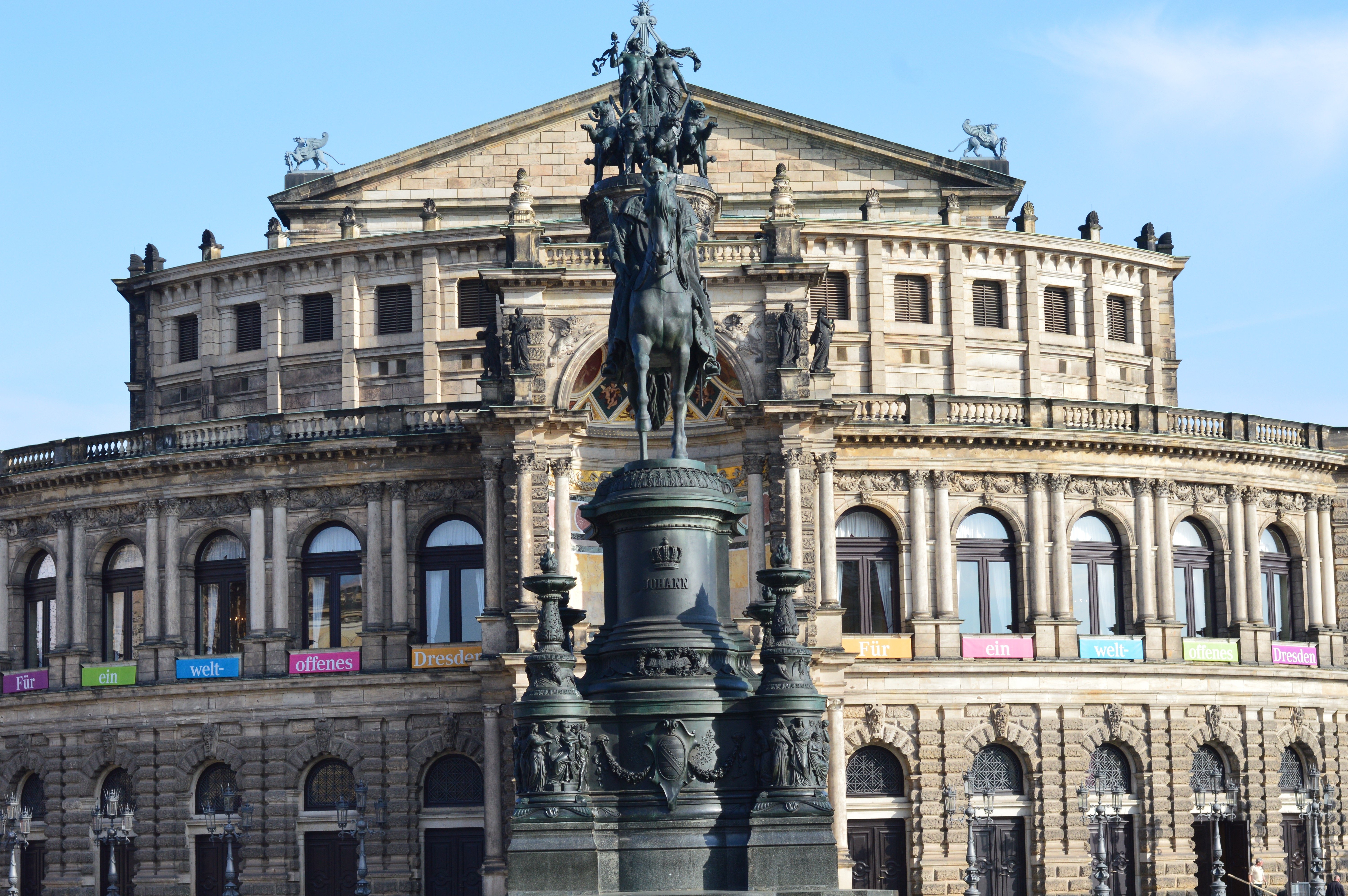 On the side of the Dresden opera house, several colorful placards proclaim: "Toward a more open Dresden."