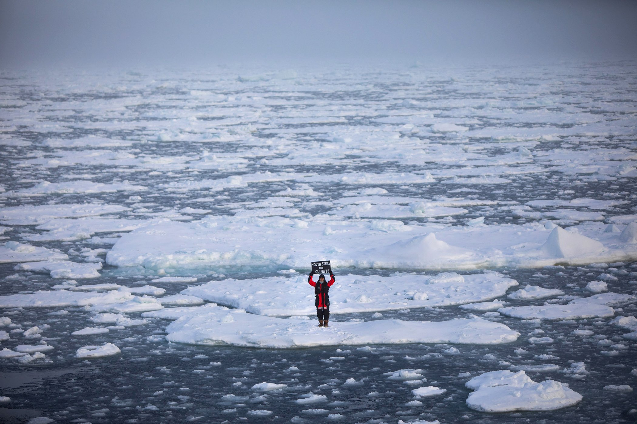 18-year-old environmental activist and campaigner Mya-Rose Craig poses on an ice floe in the Arctic as part of the most northerly climate strike at 82.2° North.