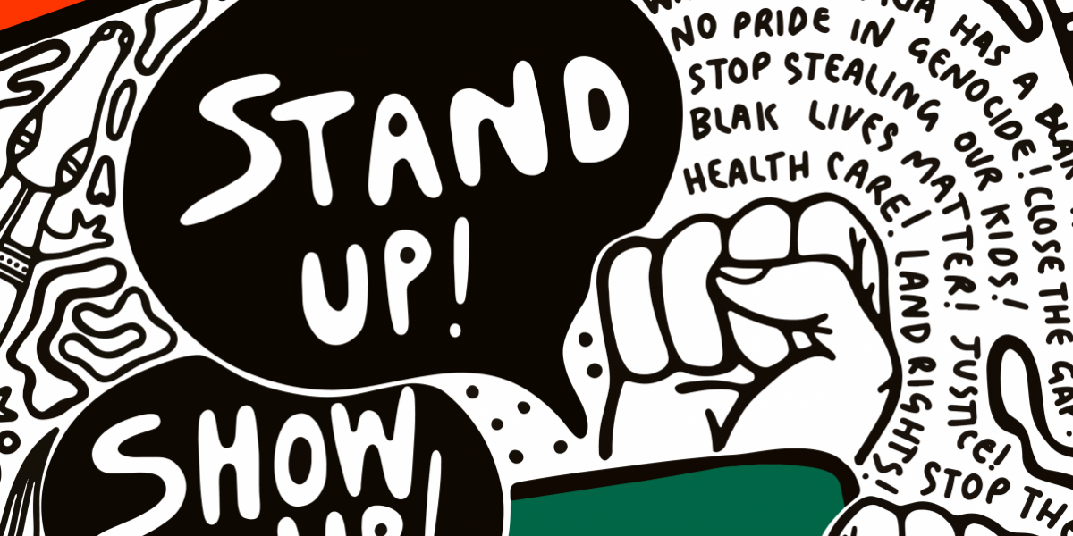 "I created this piece after reading this year’s National NAIDOC Week theme – Get Up! Stand Up! Show Up! I knew straight away I wanted to do a graphic piece centred around our flags with text highlighting what we have been through and are still fighting for,” Dank explained. “I feel that this piece being black and white allows us to focus on the details and messages in the artwork.”