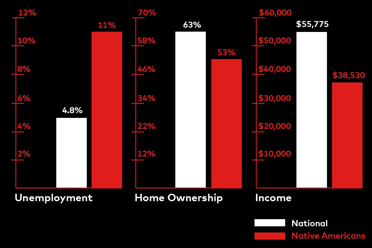 Native Americans fall short on all the poverty statistics. Compared to national statistics, they have fewer jobs, earn less, and own fewer homes, are more likely to use drugs and get arrested for prostitution.