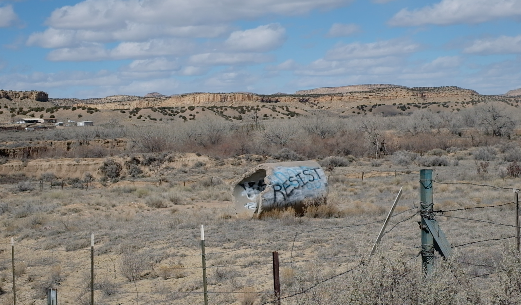 A graffiti-tagged pipe near Anna's reservation bearing the words "Resist."