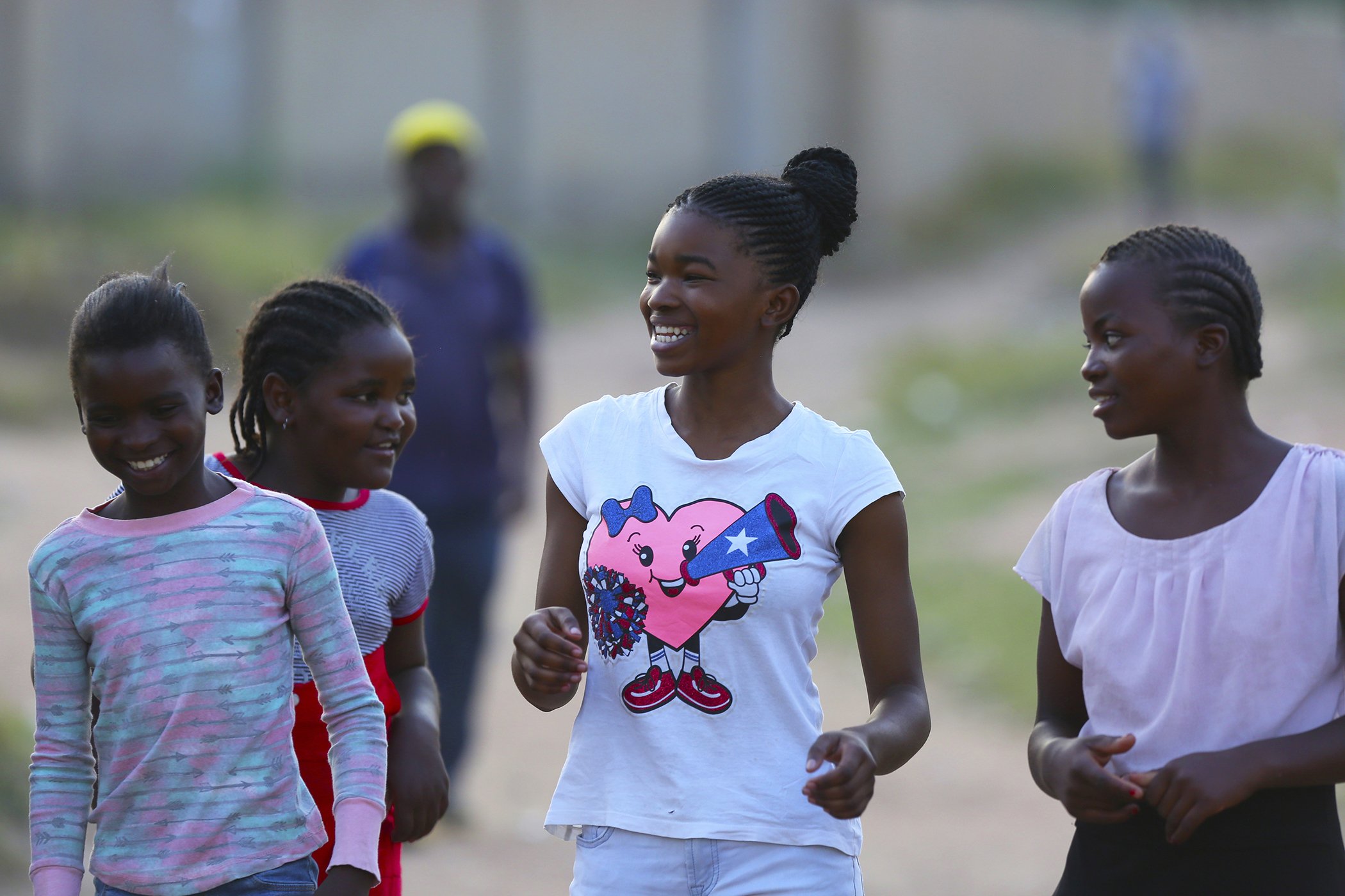 Natsiraishe Maritsa, center, shares a light moment with young boys and girls after a taekwondo training session in the Epworth settlement about 15 km southeast of the capital Harare, Nov. 7, 2020.