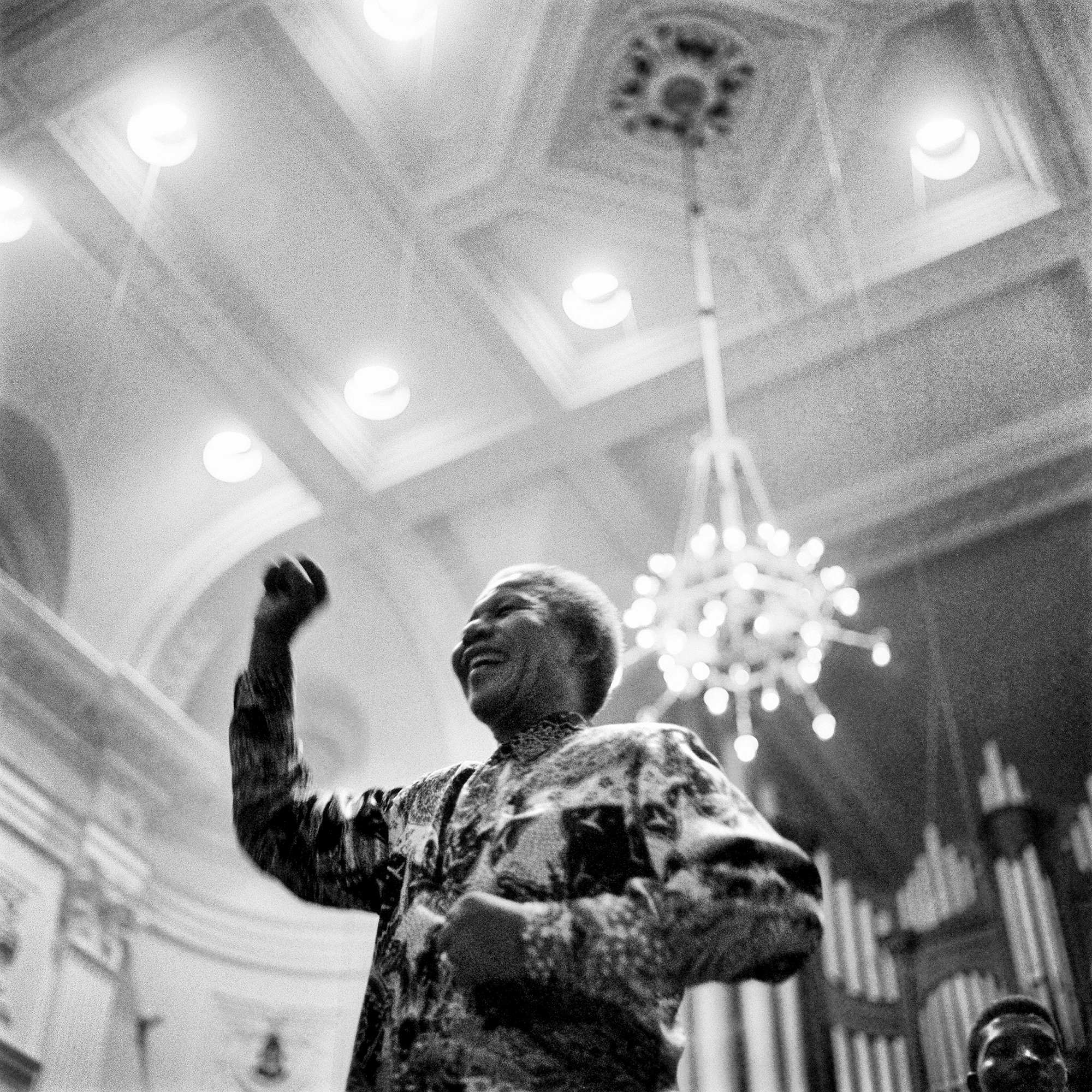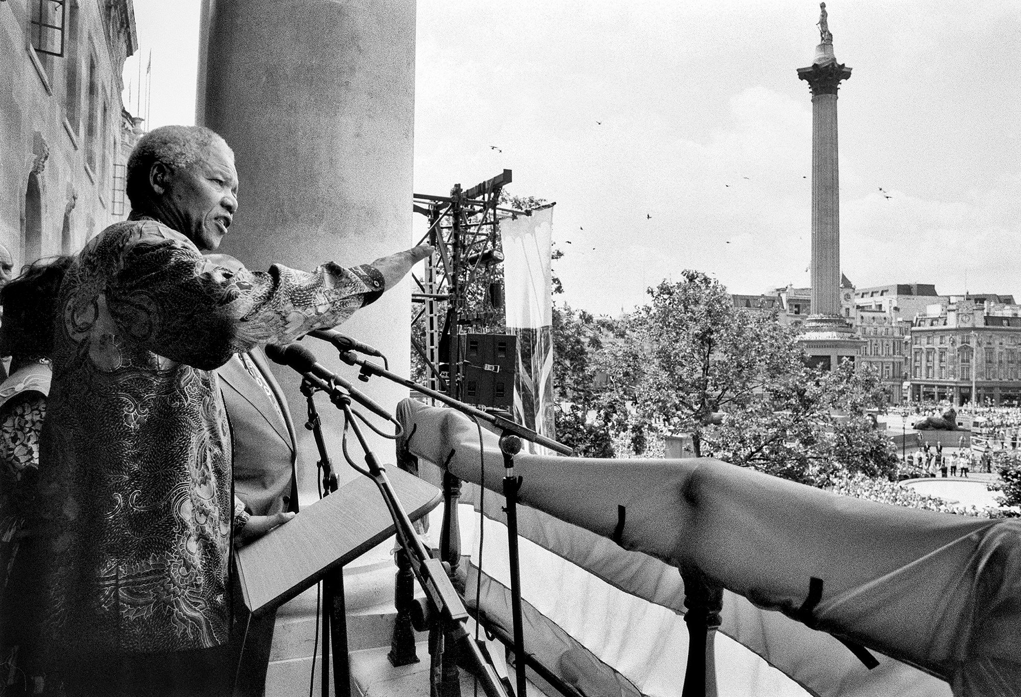 From the balcony of the High Commission of South Africa in Trafalgar Square, London, Mandela symbolically addresses the crowd gathered in 1996. Trafalgar Square was the site of continual demonstrations and pickets during the final years of apartheid.