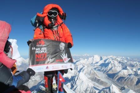 Accompanied by a team of 20 people and led by Pemba Dorje Sherpa, who holds a record for the fastest ascent, Tamang reached the peak at 6.00 a.m. local time on May 20, and held up a poster which read: "We are people not property. Stop human trafficking."