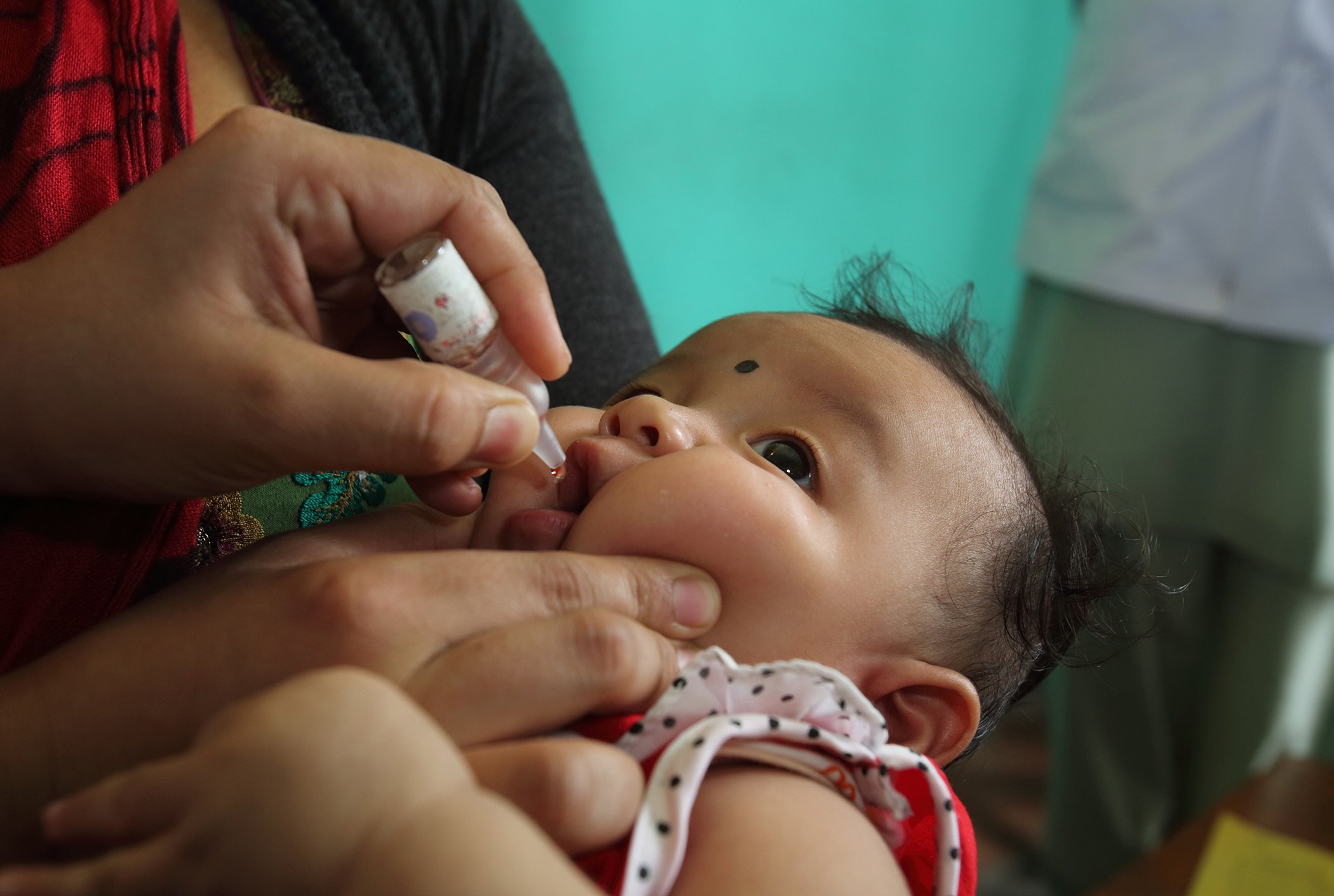 A mother brings her child to be vaccinated for polio during routine vaccinations at District Public Health Office, Immunization Clinic, Pokhara, Nepal.