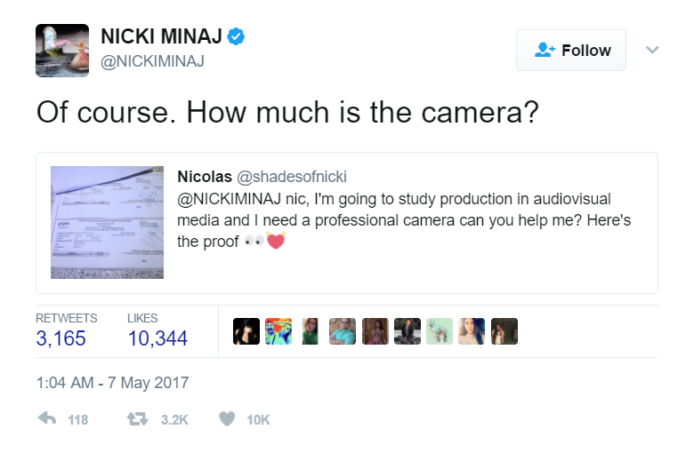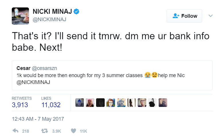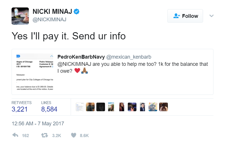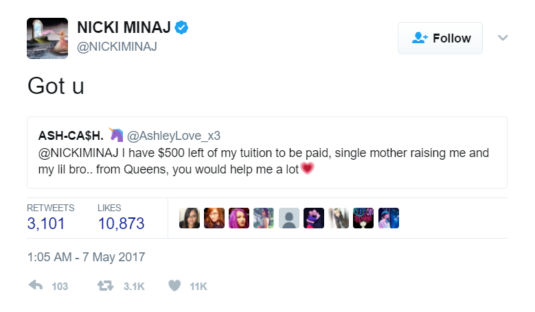— NICKI MINAJ (@NICKIMINAJ) May 7, 2017