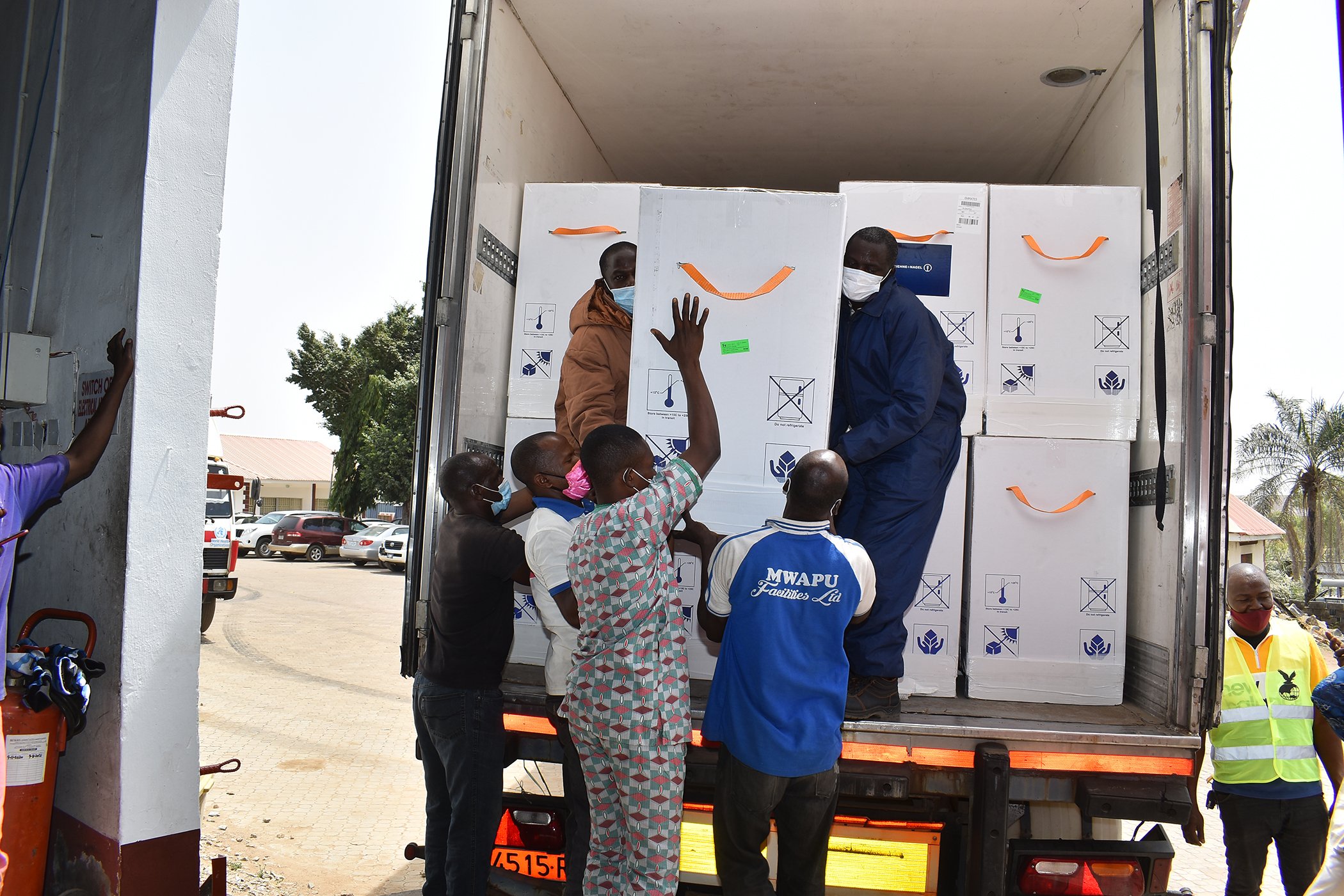 Workers offload a shipment containing 3.94 million doses of the COVID-19 vaccine procured by the COVAX Facility at the Nnamdi Azikiwe International Airport in Abuja, Nigeria on March 2, 2021.