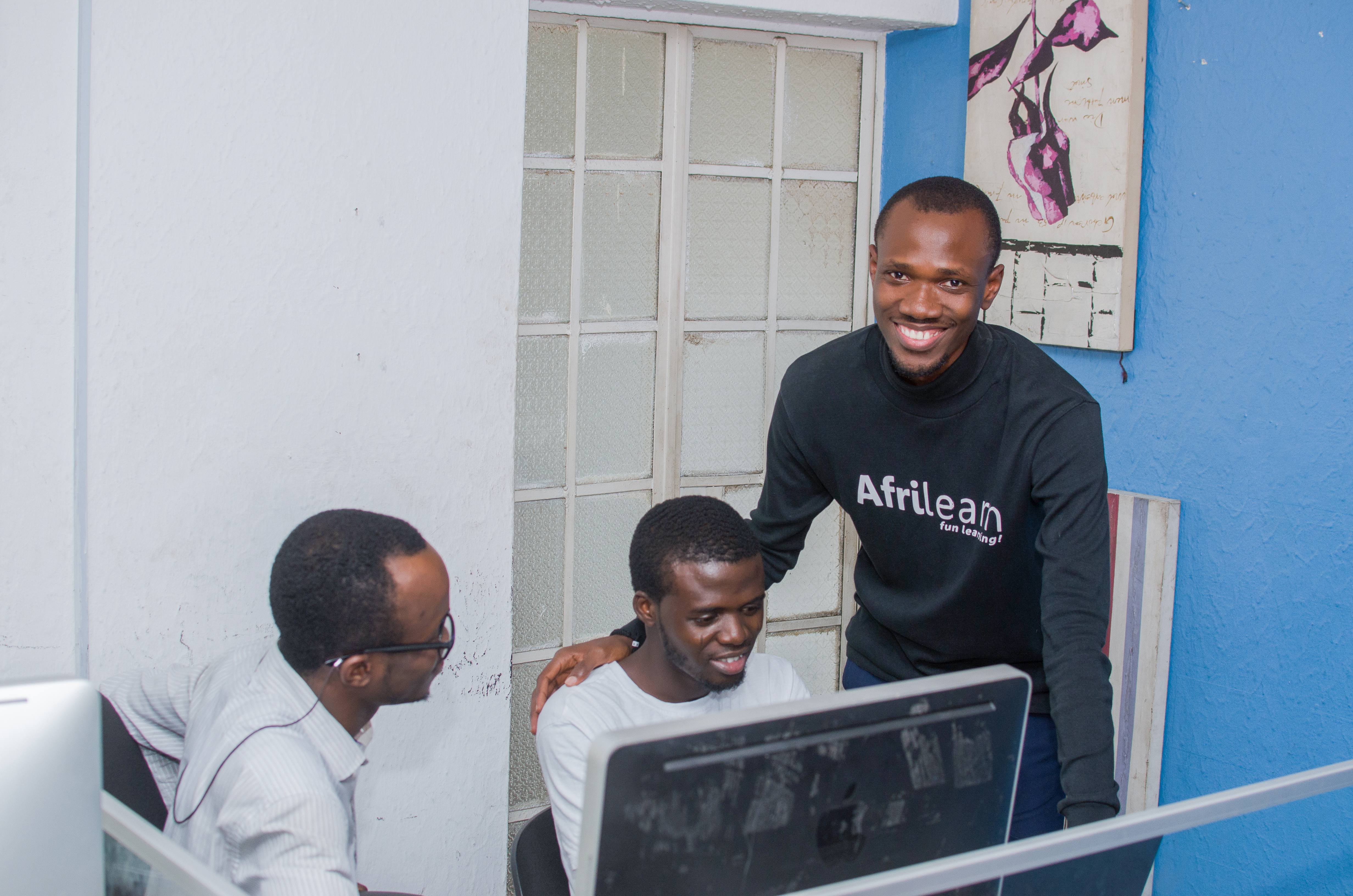 Isaac Oladipupo with software developers at Afrilearn, an education technology company in Nigeria.