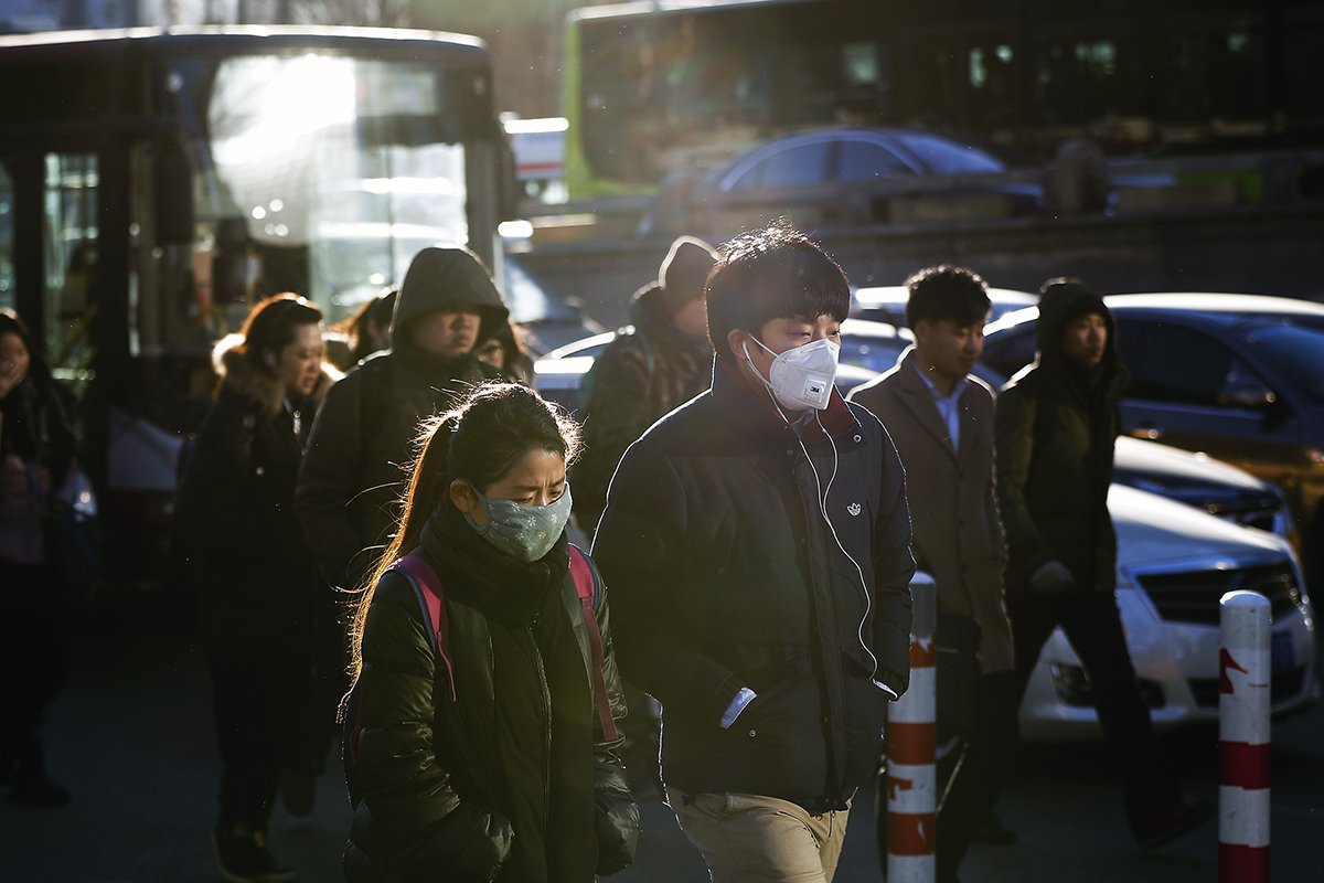 A man and a woman wearing masks for protection against pollution walk past motorists in traffic during the morning rush hour in Beijing, Thursday, Dec. 15, 2016.