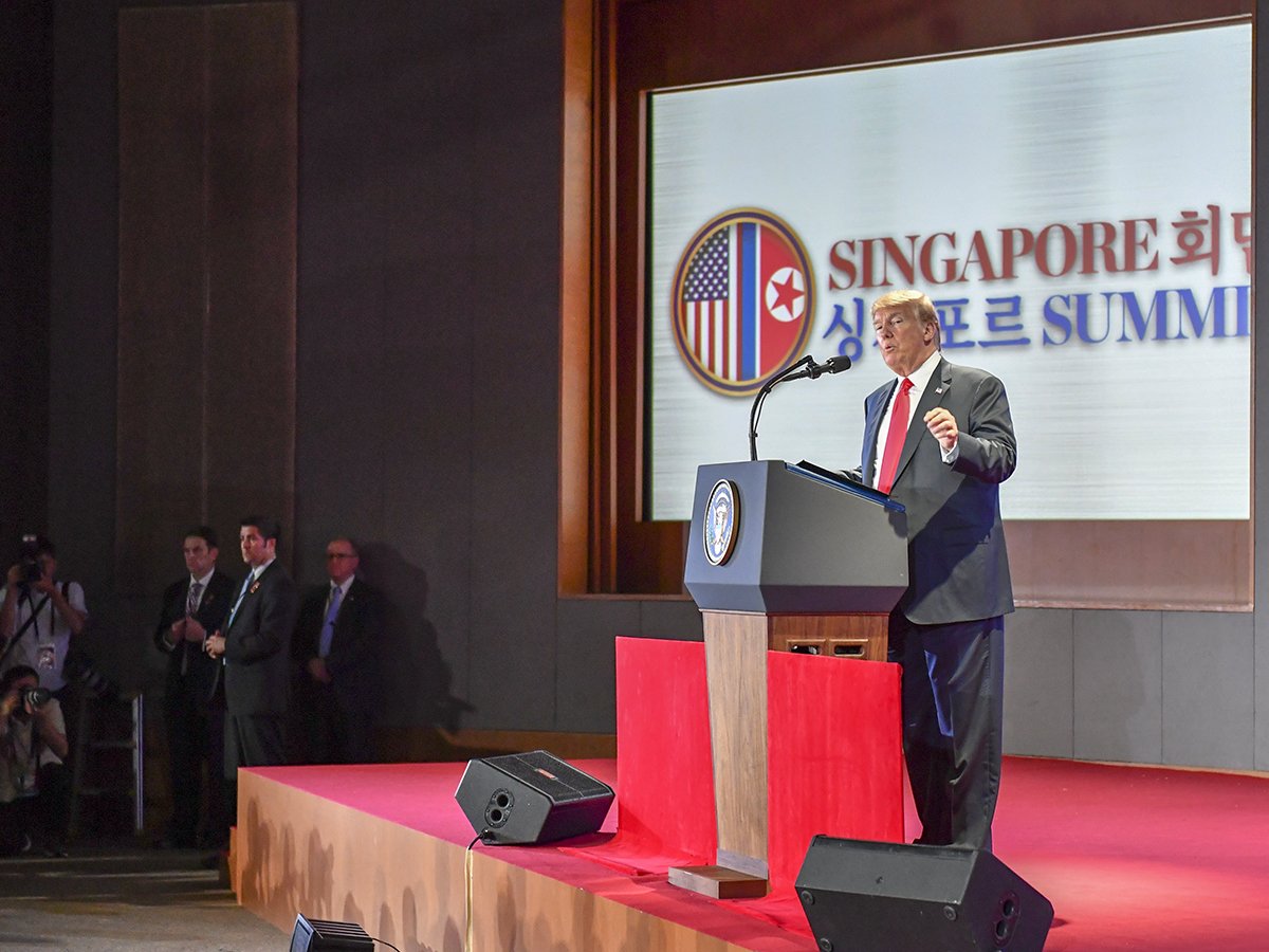 President Donald Trump addresses the press following the Singapore Summit in Singapore on June 12, 2018.