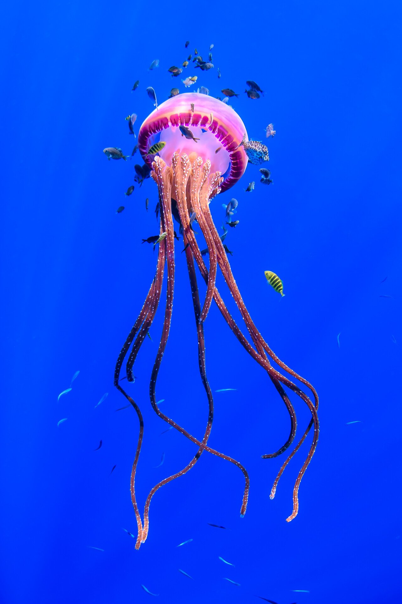 “Thysanostoma loriferum [was] locally renamed ‘Rasta Jelly.’ We came across this jellyfish a few mile off the back of the Ningaloo Reef. Its vibrant color stuck out in the blue water as we passed it on a boat. Stretching over a meter and a half and floating in the vast ocean it created its own miniature ecosystem, surrounded by an entourage of accompanying marine life.”