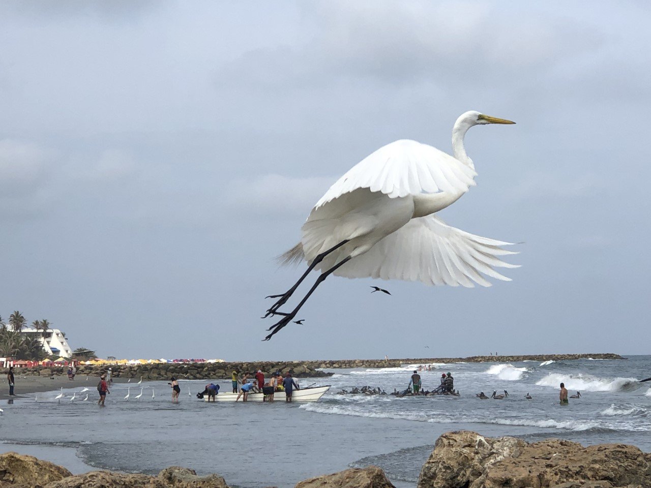 “This photo, taken in the morning, shows the activity and the dynamics between marine birds and fishermen at Hollywood beach in Cartagena, one of the most touristic spots in town. In the back and on the lower edges you can see the boat and fishermen, even the men reeling in the net and the surrounding birds. In the front, a white heron (Ardea alba) captured in flight about to join the other birds circling the fishermen and waiting for any small fish or leftovers to be thrown their way. This is a daily spectacle during the fishing season, with the fish getting invariably smaller given the relentless and uncontrolled activity of men fishing with the huge net that captures all.”