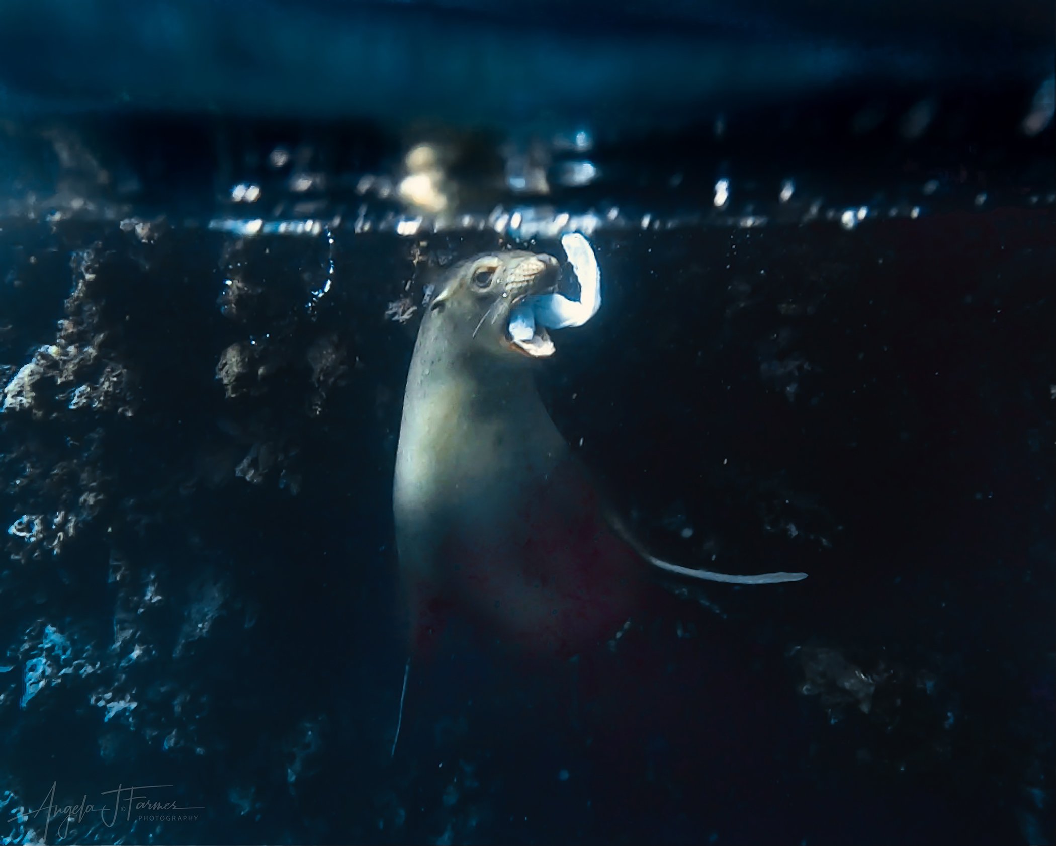 “On one of my many swims with the Galapagos seals, I was swimming along the wall of Champion Islet when I saw a young pup spinning and playing with something in the water. She began swimming faster and faster, coming closer with each subsequent pass, and showing me how to spin until I could’ve easily reached out and touched her. She was incredibly intrigued with something she had found in the water. She continued to spin as if she was teaching me how to twirl. The more playful I became, she would zoom beneath me like a torpedo, blowing bubbles and spinning in circles with her newfound toy. I dove down and tried to mimic her, only to realize she was mimicking me and had a piece of plastic in her mouth. The very thing I try to protect these beautiful creatures from had become a toy to her. I took the chance when the pup left the plastic for me to play with on my turn and hid it from her. It was heart-wrenching to hide the very thing I know was bringing her so much joy but killing so much sea life. I urge you to do your part in saving our ocean and sea life by only supporting brands that use alternative non-plastic packaging.”