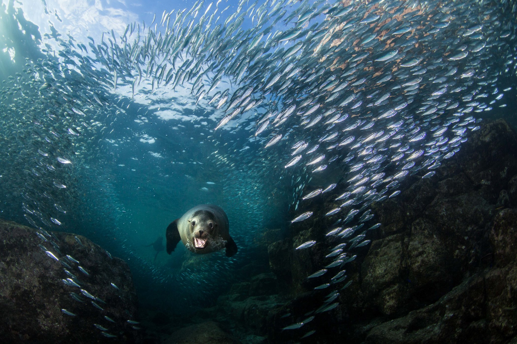 “I have returned to this specific dive site [Los Islotes] several years in a row and determined that October is the best month for both sea lions and big schools of sardines. People are diving and snorkeling with these sea lions nearly every day for nine months of the year, so they are extremely accustomed to the presence of humans. I desperately wanted to capture one of these pinnipeds blasting through a ball of fish, but it all happens so quickly and, without planning, it’s easy to miss these shots. By the end of my dive, after watching this female sea lion swim figure eights around the same rocks, I finally timed it correctly and positioned myself right in the thick of the fish and waited for her to pop through. I think she was a bit surprised to see me!”