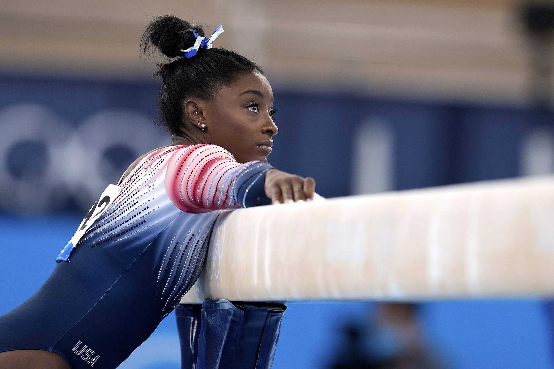 Simone Biles, of the United States, preparers to perform on the balance beam during the artistic gymnastics women's apparatus final at the 2020 Summer Olympics, Tuesday, Aug. 3, 2021, in Tokyo, Japan.