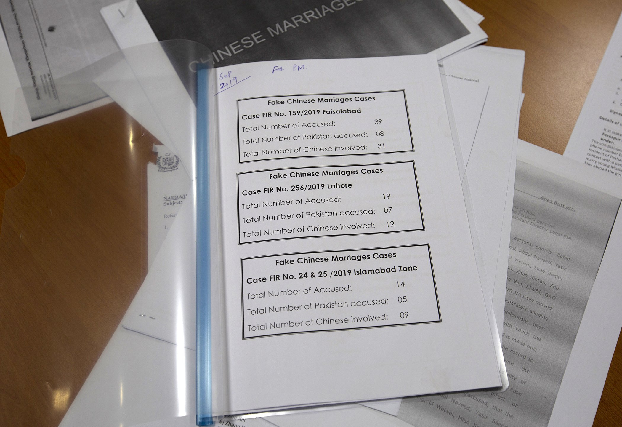 A pile of documents related to the trafficking of Pakistani brides to China is displayed in Islamabad, Pakistan. The Associated Press has obtained a list that identifies 629 girls and women from across Pakistan who were sold as brides to Chinese men and taken to China.