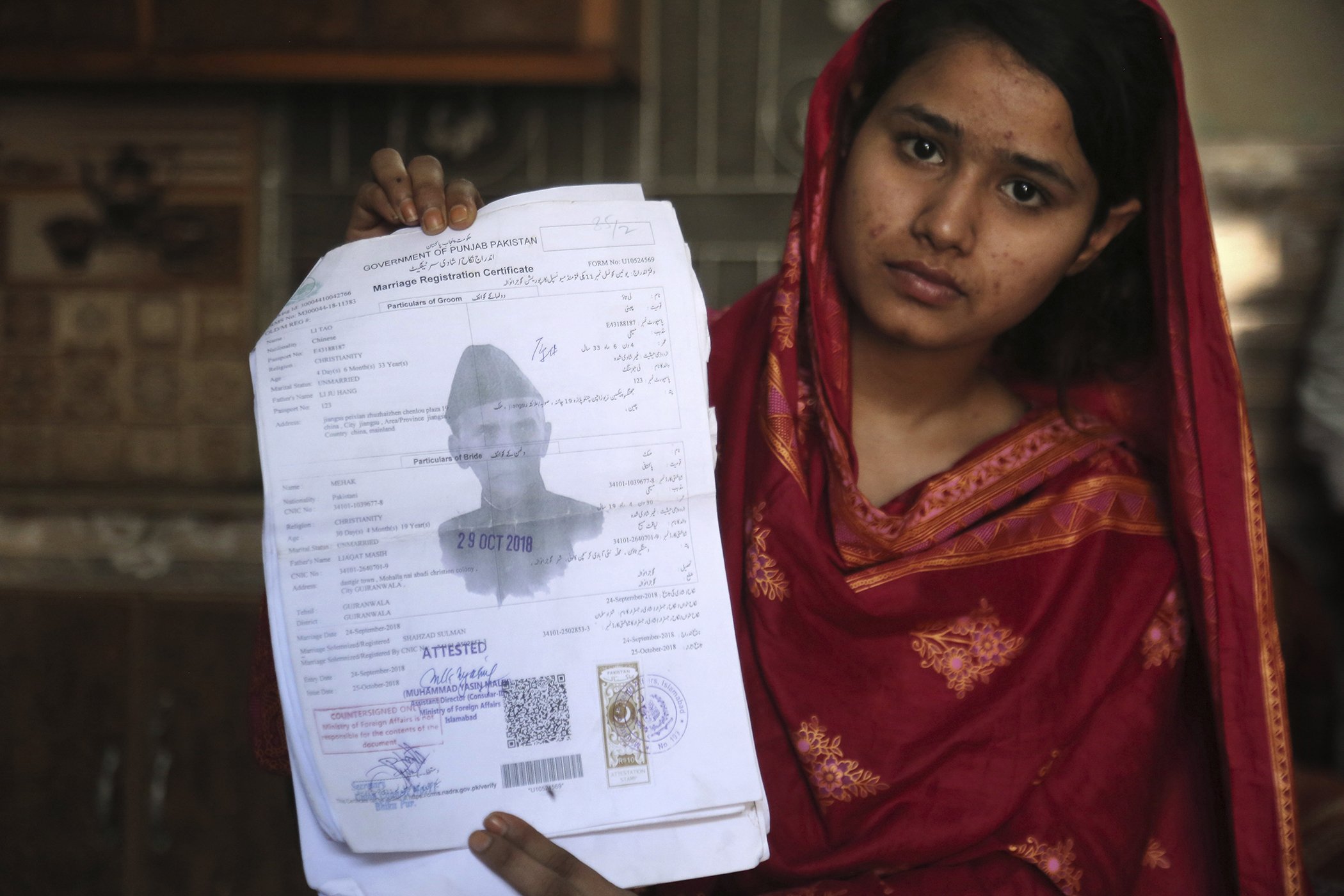 Mahek Liaqat, who married a Chinese national, shows her marriage certificate in Gujranwala, Pakistan in April 2019. Poor Pakistani Christian girls are being lured into marriages with Chinese men.