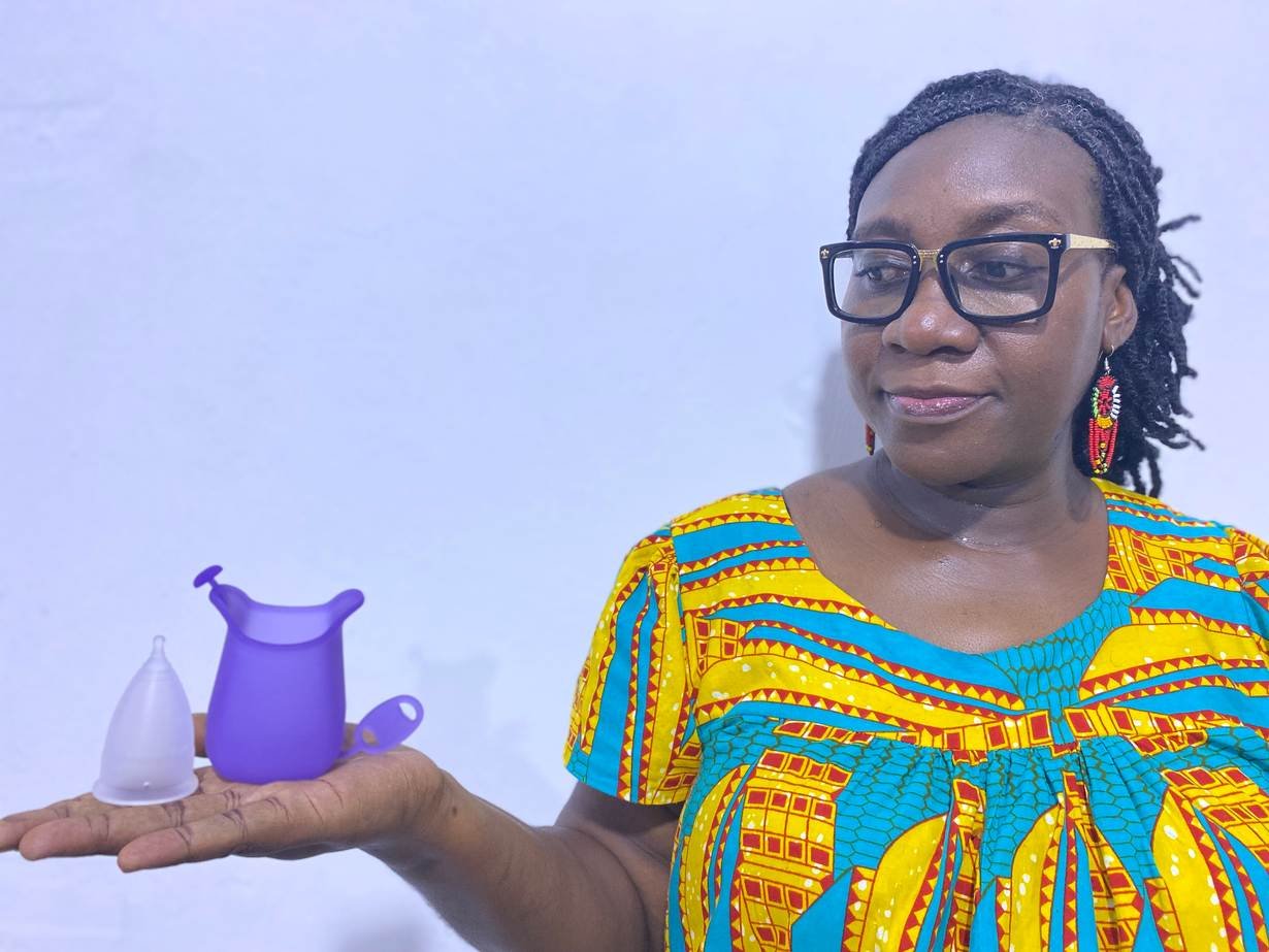 Awo Aidam Amenyah, founder and executive director of Child Online Africa displays a menstrual cup on July 9, 2022.